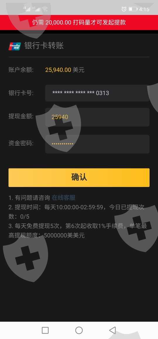 盈利之后无法提现,说是要再入七万一千进去,把方案操作完才可以提现,骗子。