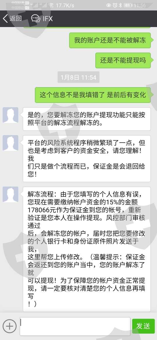IFX操作收益后银行卡号被平台改了导致无法出金,提现记录一直审核中,说是已经把账户冻结了,需要缴纳账户余额的15%充值到账户中才能申请修改银行卡信息,才能解冻账户,才能提现出来,意识到这是诈骗了,现在本金都被套在里面出不来,已报案处理,大家别再上当,还有在这个平台上曝光也请协助排查处理,非常感谢!