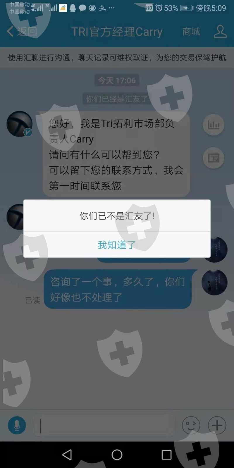 我在拓利平台交易不到两个星期 账户被禁用 后台也登不上 咨询情况话还没说完直接把我删了 官网客服联系也不理人 我的钱全被平台吞走啦