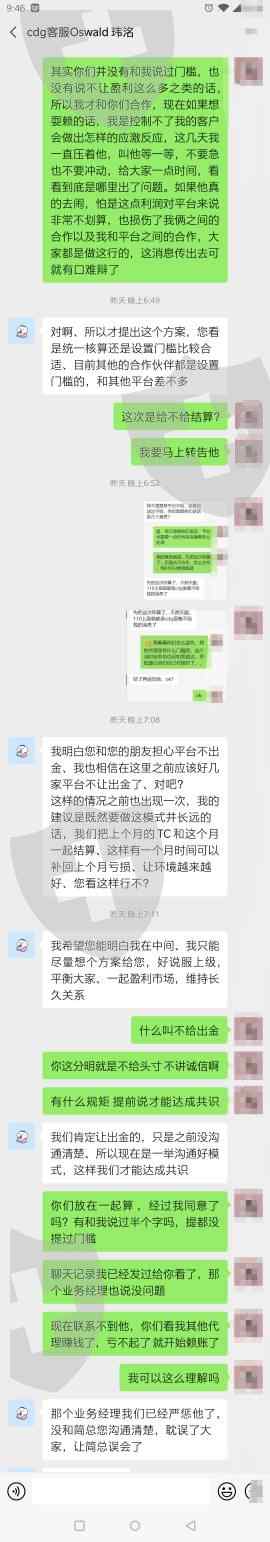 和平台谈好了按月结算15%的头寸,作为代理的回扣,现在竟然赖账说把我的账号和别人的代理混在一起!最终承认是业务经理没说清楚,并且给予惩罚,那个我有什么关系呢?业务经理代表平台,不是个人行为!承诺给的一定要兑现,我2020.12月的头寸 应该结款给我1365美金,这点钱就能赖账,非要我来曝光你们,也真是好意思!下面有我合作商与平台客服的对话,业务经理压根联系不上,就让客服出面!