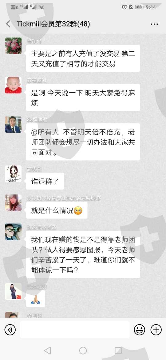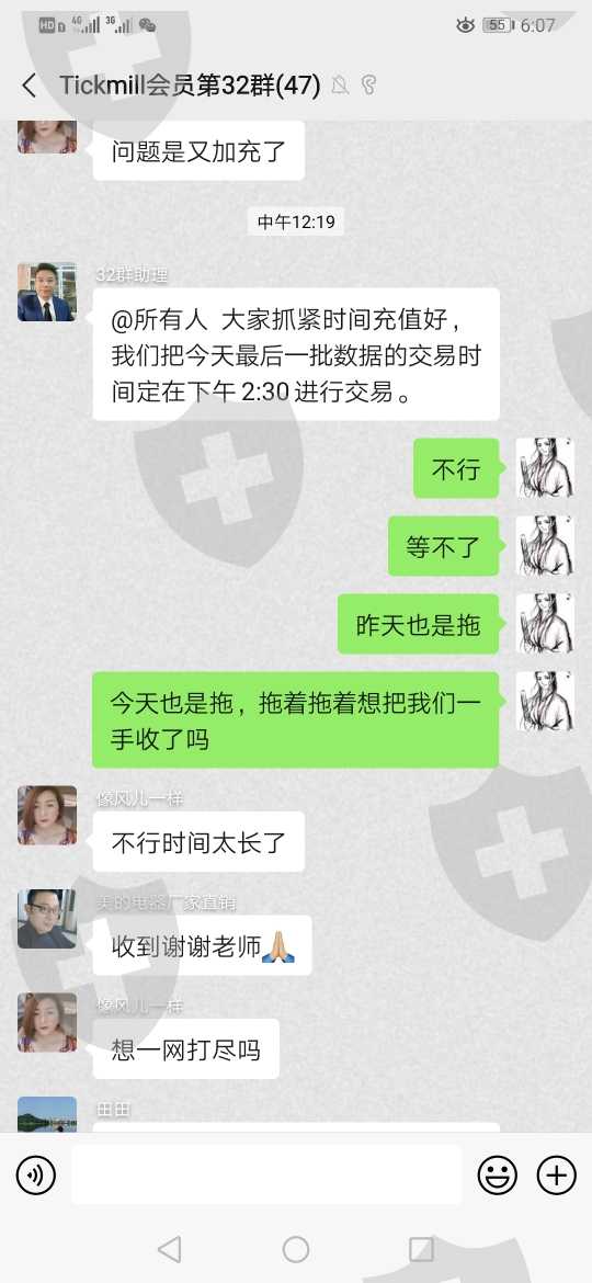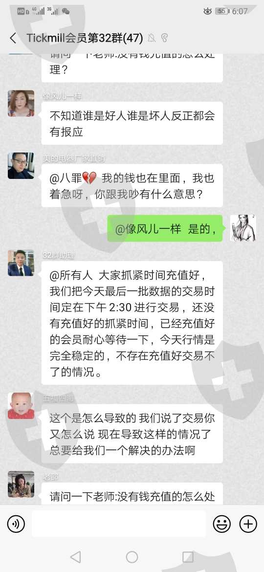 一月四号开始加上老师通过二维码下载Tickmill软件,1月4号至1月12正常交易,1月13号早上进行充值,老师以有活动要考虑他人利益为由让推迟交易,等他人充值,1月13号一直推不让我们进行交易,第二天1月14日让进行倍充才能交易提现,分两批交易,交易以后不能出金,再次询问客服就说违规操作冻结了,让缴纳百分之三十保证金才能解冻,群友缴纳百分之三十保证金以后并未能如期到账,随后带我们玩的老师把我们微信好友删除了,第二天1月15日平台就进不去了,活生生套路,骗子,共计被骗68600元整,