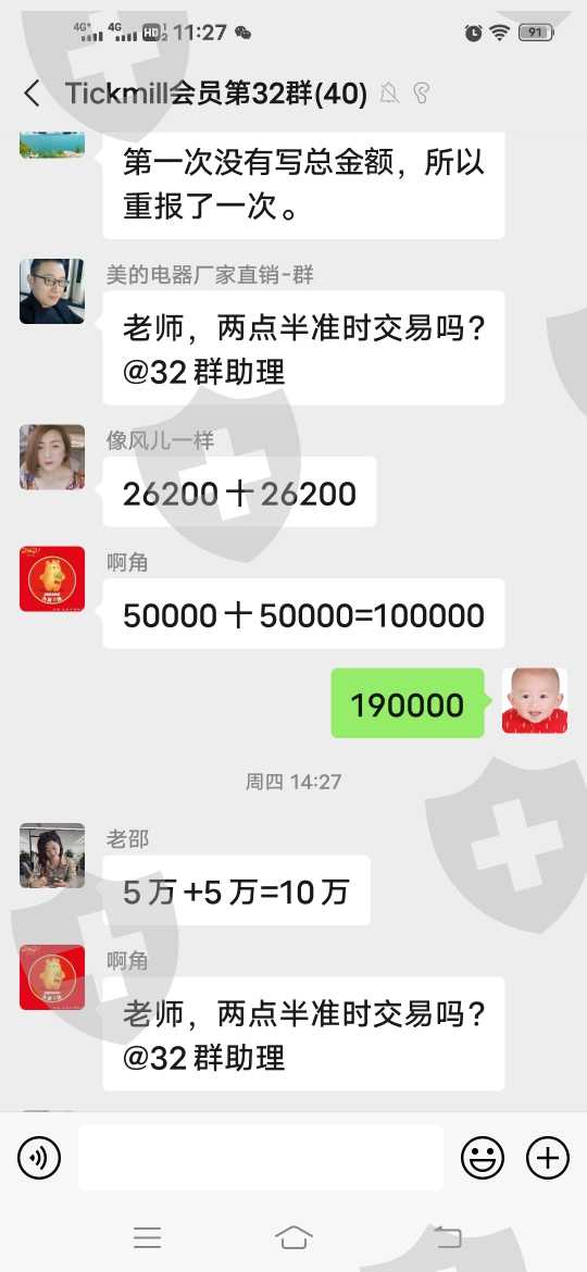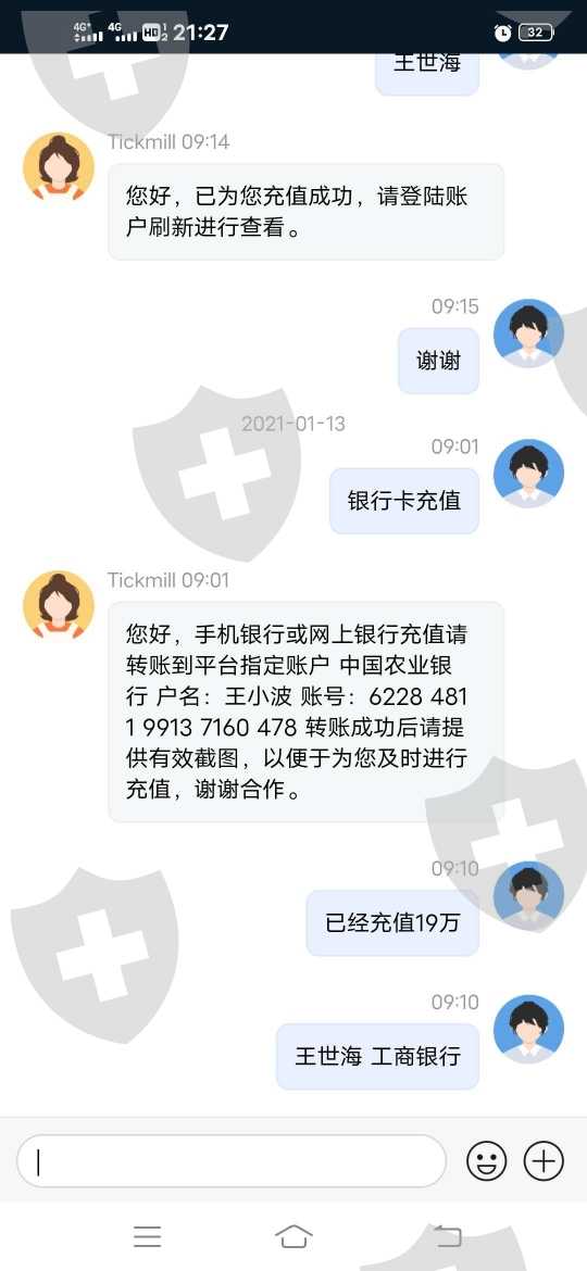 通过网络加上老师带我们玩外汇赚钱,Tickmill平台1月4号至1月12日每日进行正常交易。2021.1.13日开始反常,说平台周年庆活动以12%的盈利为由,骗我们进行充值,当天说充值人太多 波动太大,无法测试指令,推迟交易。14号叫我们充值13号同等额度,就可以提现自己本金。共计充值人民币19万元整,却并未能出金,联系客服回答说违规操作被冻结,最后要我们缴纳30%保证金解冻,就可以提现。群内老师一直催缴纳保证金,他们规定时间已到,就把我们全部拉黑