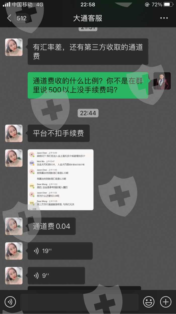 大通金融忽悠客户,太低劣的方式来占客户便宜:本来盈利的账号还在浮亏就直接强行平掉我们的,出金也没有提前告知就直接撸掉我们4个点,而且自行降低出金汇率,这样的格局眼光大通真的请不要在中国市场浪费时间了
