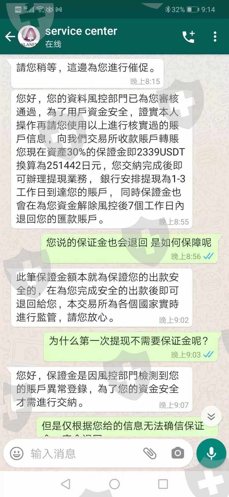 ALANFX平台结束交易后,上午申请提现。下午发现已经无法登录app账号,询问客服说是账户冻结。先后要求证件照片,和账户资料进行身份认证。认证后要求30%保证金。