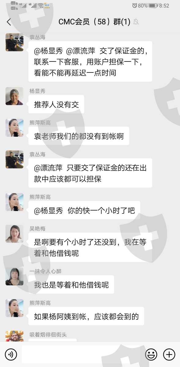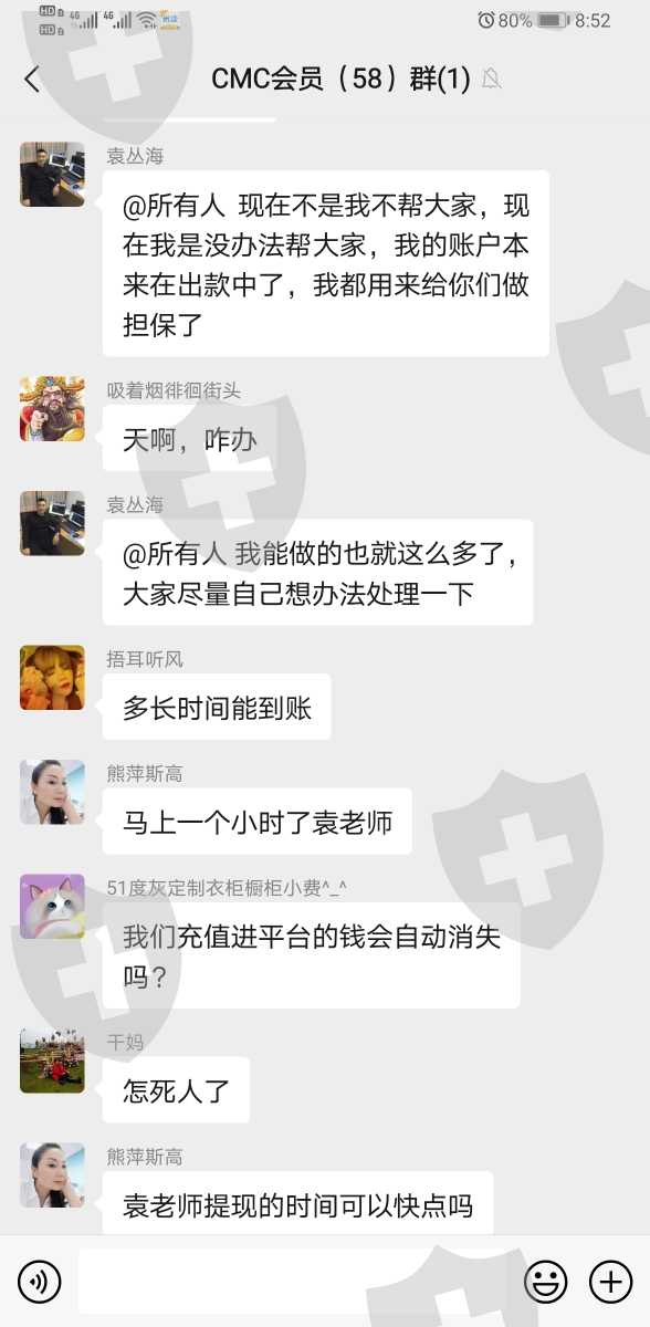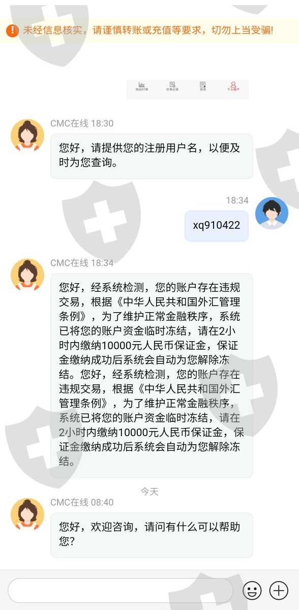 CMC所谓的老师教你操作赚钱,先是建一个群,然后一群自己人不断的吹老师怎样怎样厉害,帮自己赚了多少多少钱,各种感谢老师,然后说自己投了多少钱赚了多少,麻痹其他人跟着投甚至一些人到处借钱来投,之后现金提现提不出来,联系客服,客服说资金被冻结,需要一万元解冻,之后除了受害者,所以骗子都找不到了。