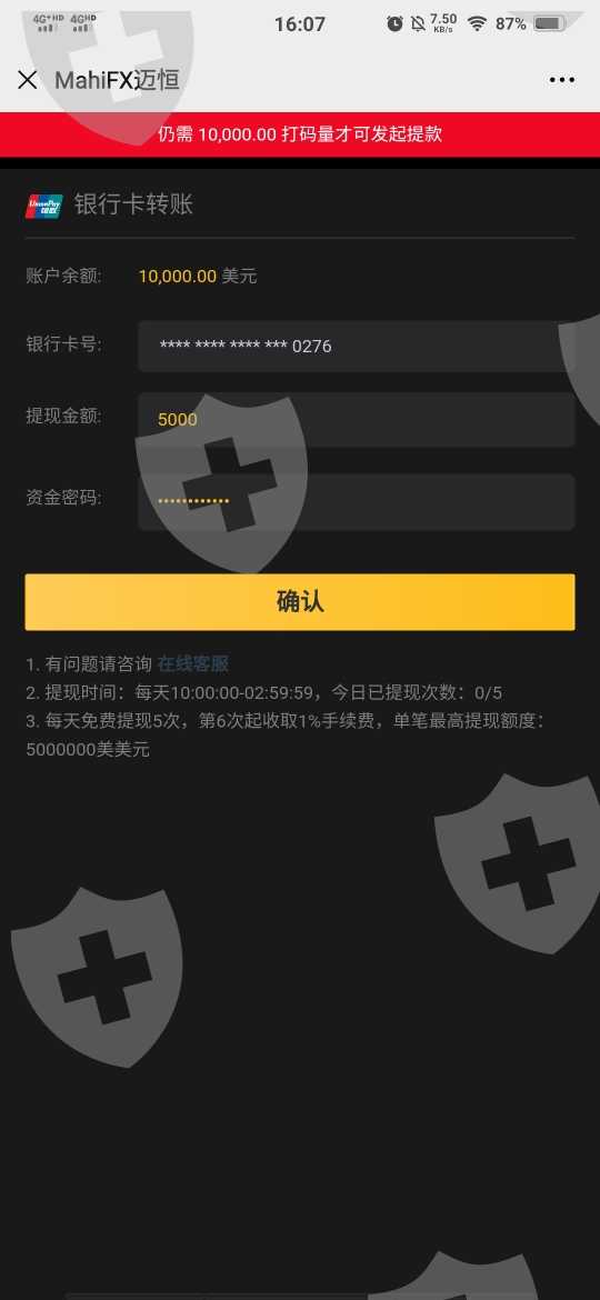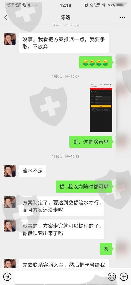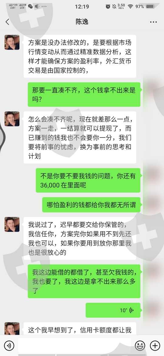 开始的时候聊天和你套近乎,后来说带着我赚零花钱,汇率1:7.1,最低是100美金,可以赚20美金,折合人民币142,第二次说可以投1000美金,人民币是7100,可以赚1420快钱,第三次说的是一万美金,说不稳定怕我损失,不让我冒险,有2万美金的方案让我走,去筹钱…没弄到钱就变了嘴脸,他说借给我3.6万,一共是10.2万入金,现在提不出来,就是个骗子团伙作案,大家需谨慎…