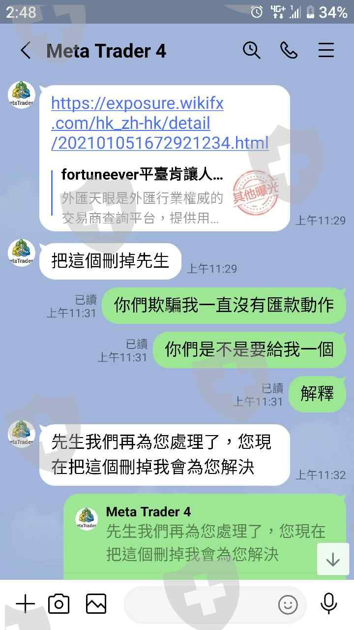 fortuneever此公司是詐騙集團的黑平台,都依照他們指示匯款出金結果還是一毛錢都拿不到,只要出金他們有千百種理由推辭不出金匯款,之後就會把你封鎖,所以各位不要受騙了,還有也不要相信網路陌生男女生加入投資以免受騙上當跟我一樣。
