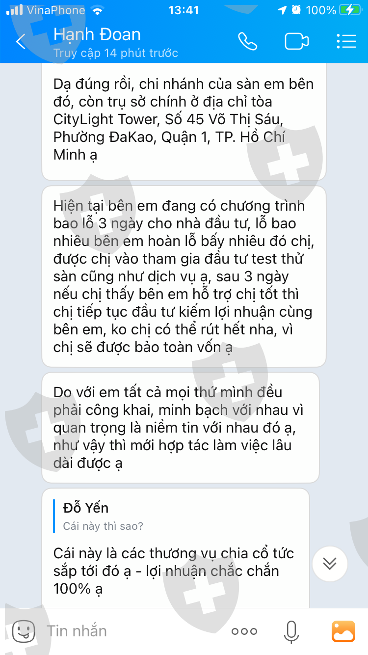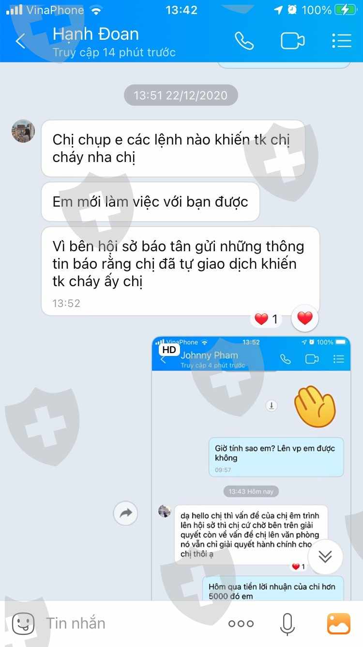 Tôi bị Hạnh Doan ( 0907912398 ) Va Tan ( 0903725241 ) lừa đảo với tk đóng 150 triệu, giao dich theo cổ phiếu của chuyên gia và mất hết 17, 000 đô , họ khuyến khích tôi đáng Nas100 để cò tiênn nuôi cổ phiếu, giờ sàn LCM kg đền vì nói là lỗi của chuyên gia, đi đòi chuyên gia, giờ tôi cần hổ trợ của ai đó biết 2 tên lừa đảo này làm tk tôi bí cháy, họ khẳng đnh là nếu sàn kg đền họ sẽ đền tôi.