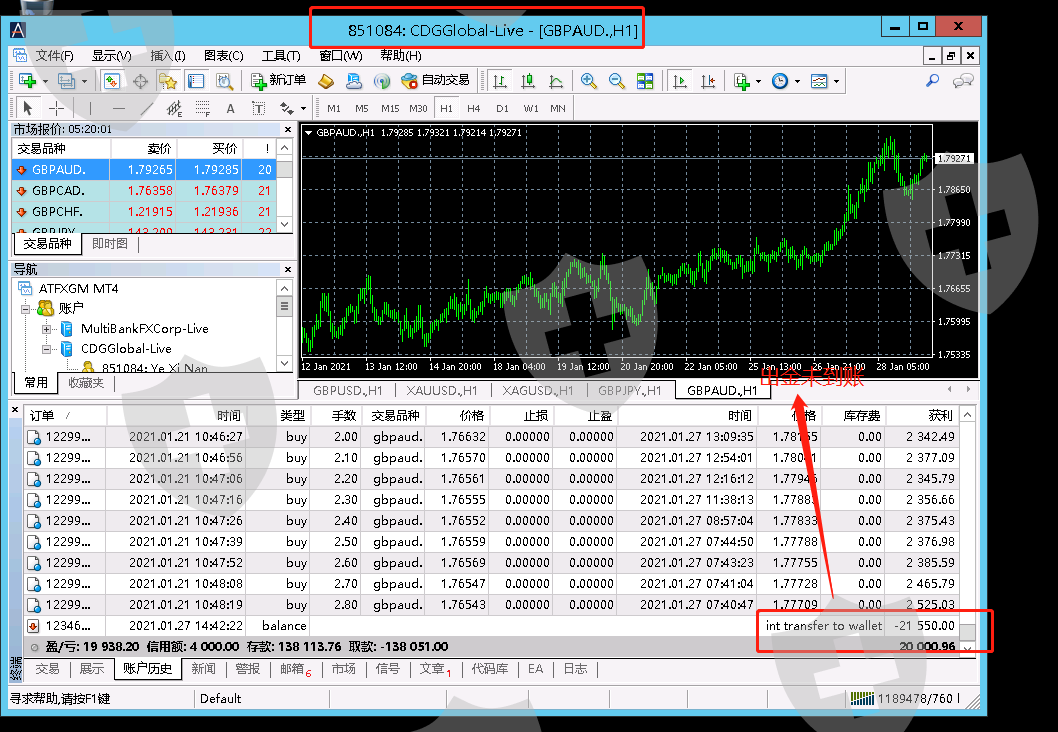 2020年10月30日,我在CDG开了一个交易账户851084,并且入金2万美元,赠金给了20%,并且出盈利不会扣除赠金,也说了封顶最高只能盈利120%我也同意了。12月份说有iphone12赠送,交易满350手,并且可以允许出盈利20%以上不影响(我每次出金都在100%以上),所以同意拿了iphone,条款里面有写说如果未达到交易量申请出本金,则会扣除1400美元作为手机的成本。2021年1月27号,我申请出盈利21550美元至今仍然没有到账,交易账户里面还有2万美元,连同本金总共41550美元说全部不给出金,况且本金我并没有申请出金,同时我也答应手机条款的1400美元让CDG扣除后给我出金到账,也不同意。