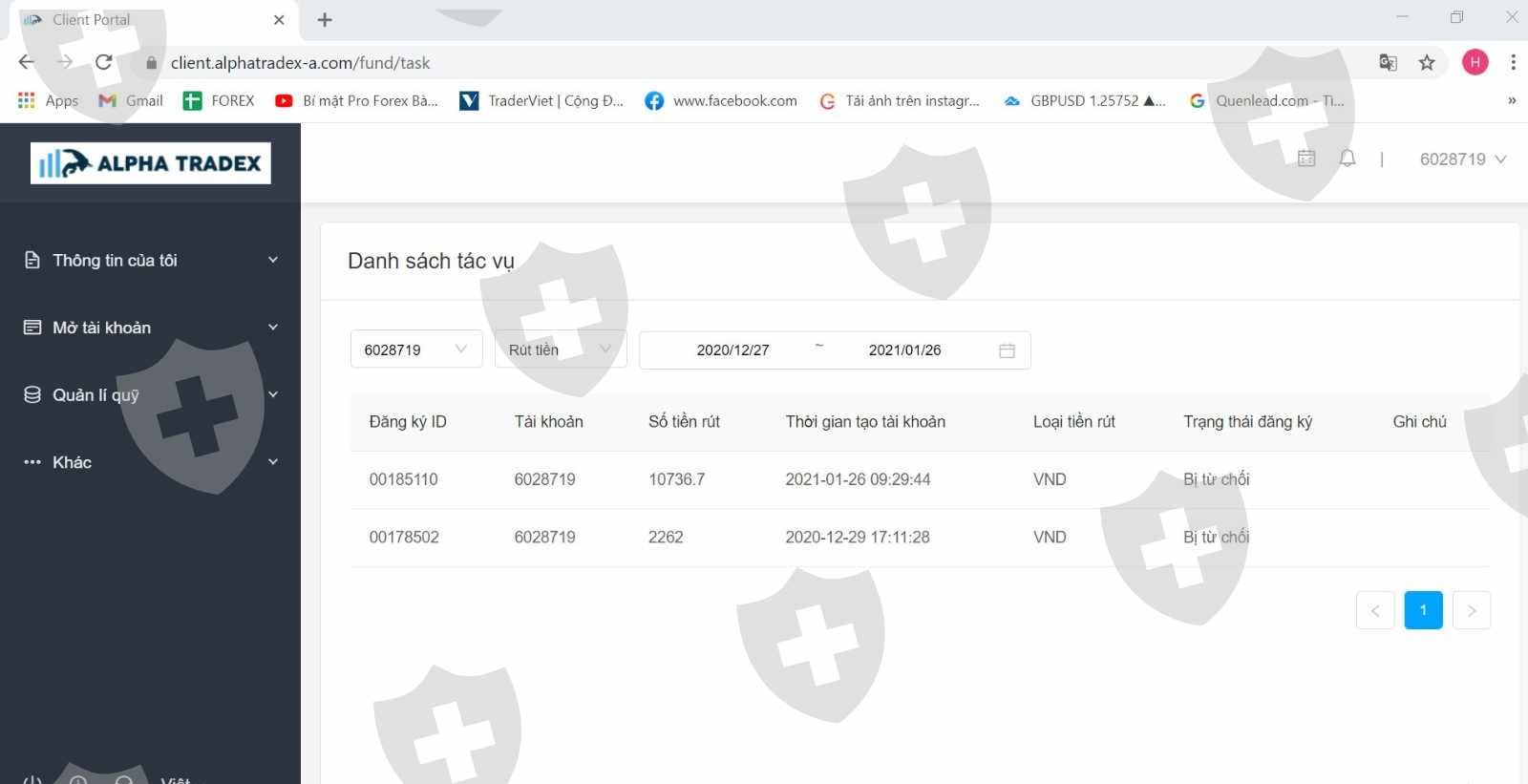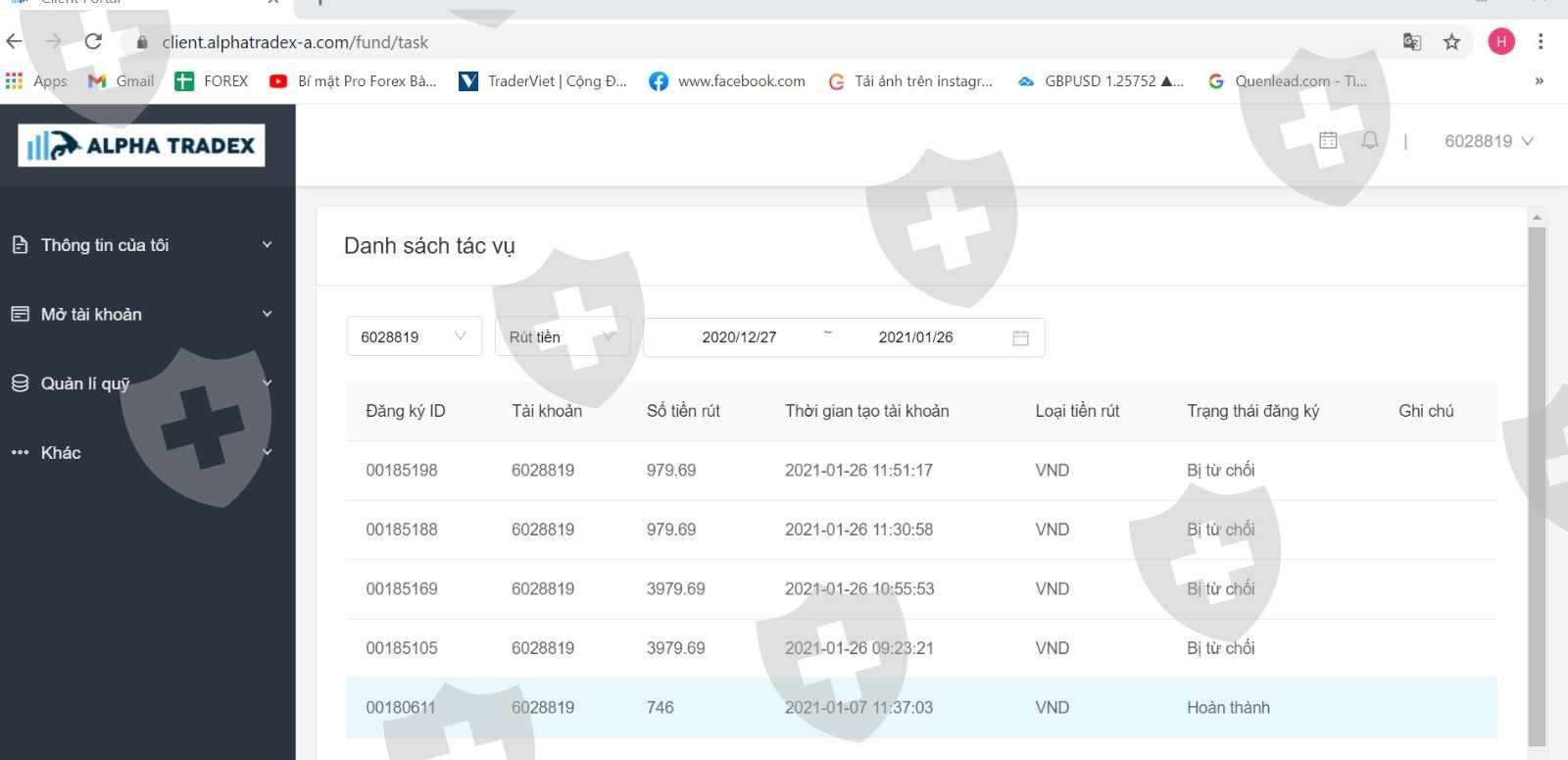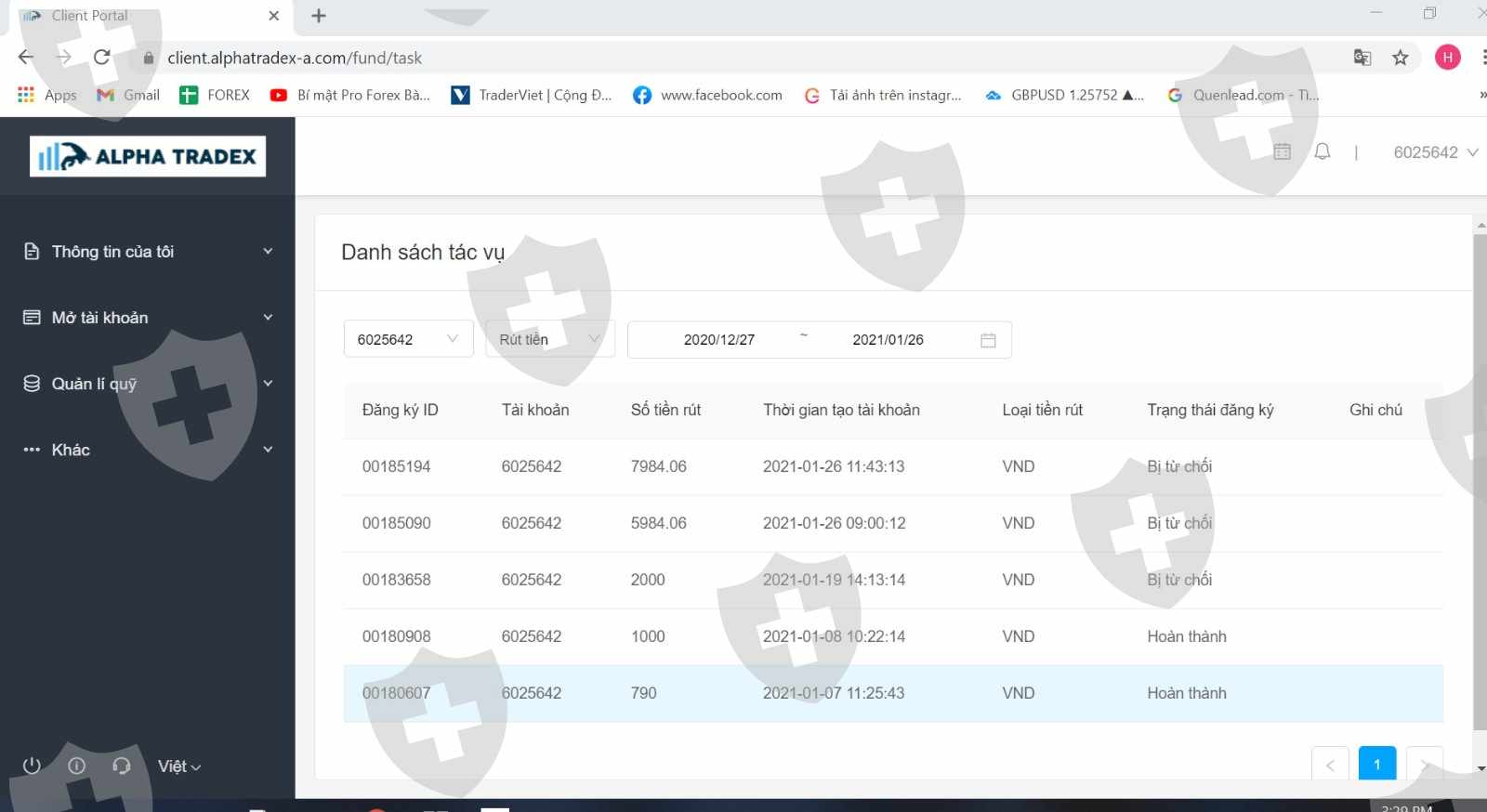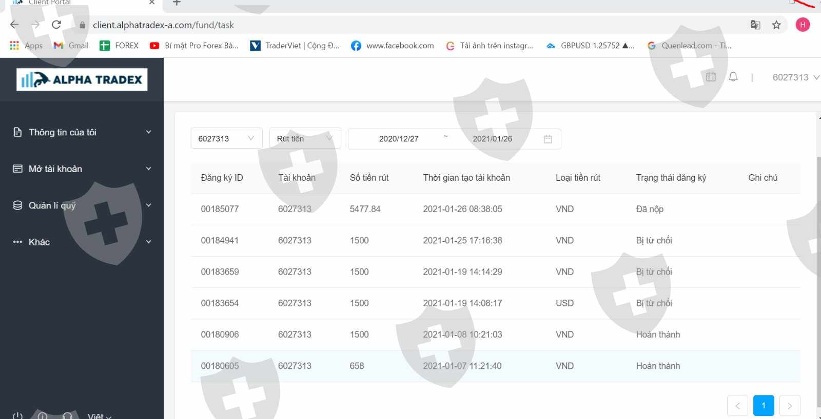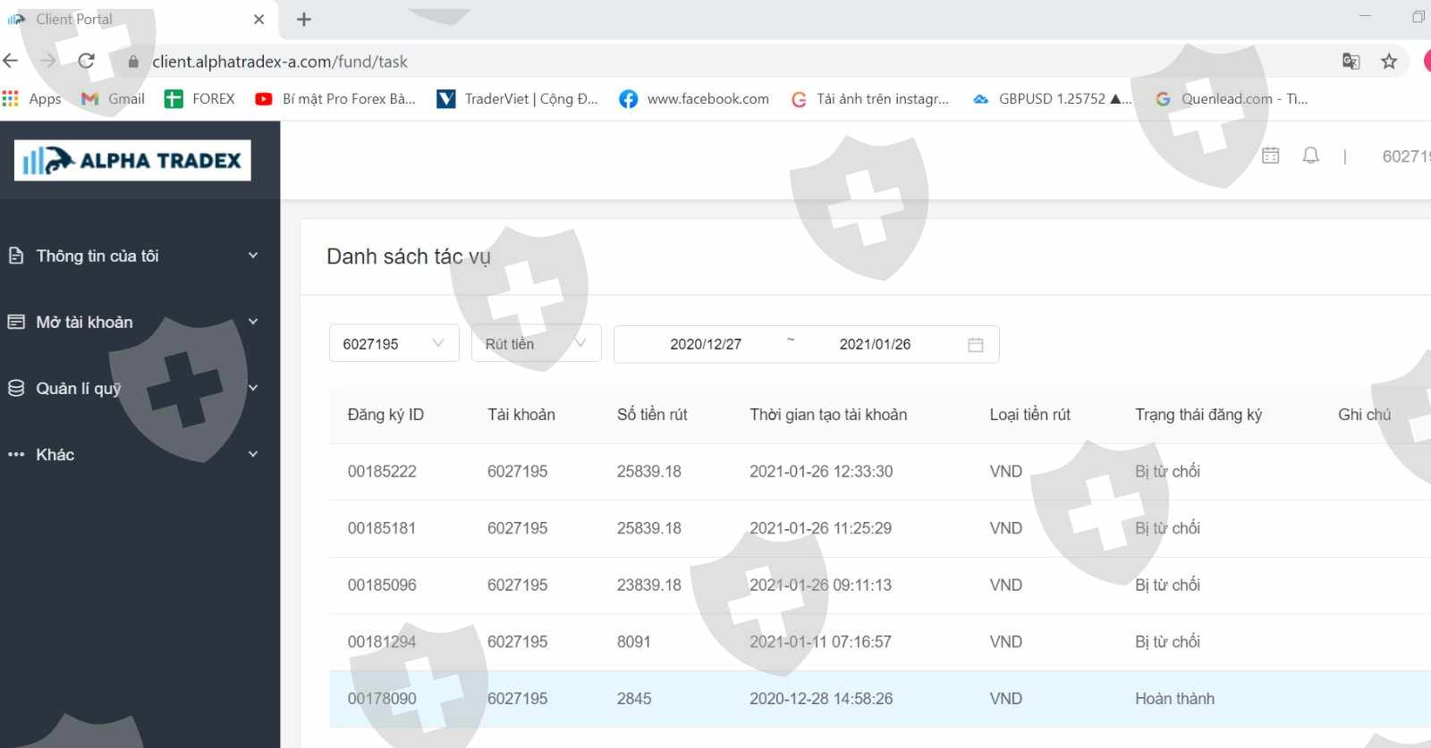 Tôi có làm lệnh rút tiền của các tài khoản giao dịch đã đóng lệnh của sàn Alphatradex nhưng tôi đã không thể nhận được tiền sau khoảng 3 tuần. Sàn đã không đưa lí do không rút được tiền và bắt tôi chờ đợi. Tôi được biết có nhóm khách khác ở Hà Nội vẫn được thanh khoản tiền nhanh chóng .