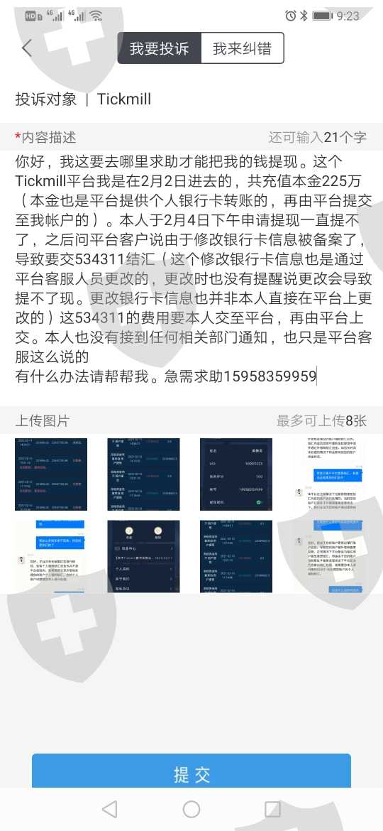 Tickmill还我血汗钱,平台进去充值的钱多是转入私人银行帐户,提现了说更改银行卡了被备案,要交534311强制结汇这笔钱还必须的交给平台代缴。昨天早上已经把我屏蔽进不了平台