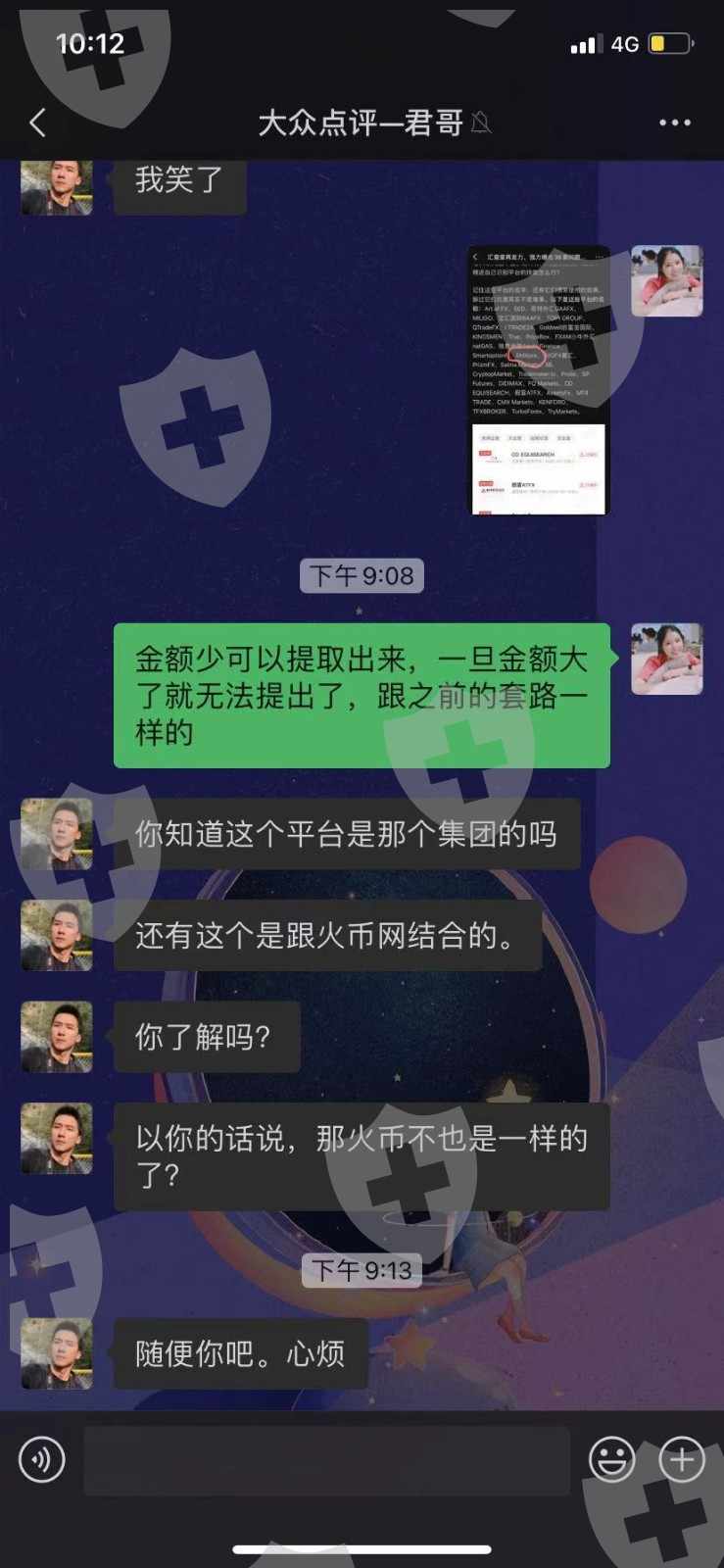在大众点评上认识的这个骗子,诱导下载APP进行交易,说有个新人活动,办理之前没有没有说风险,然后后面骗子还说我自己没有看清楚,还说业务已经办理无法驳回,看到有太多人受骗了,群众们擦亮眼睛,骗子真的太多了,还有自己的假投资截图了出来,形形色色,假假真真我能做的就是把自己的事情曝光出来,让人看到,减少被骗的机会