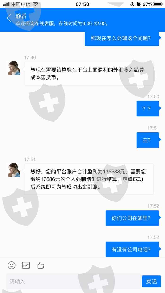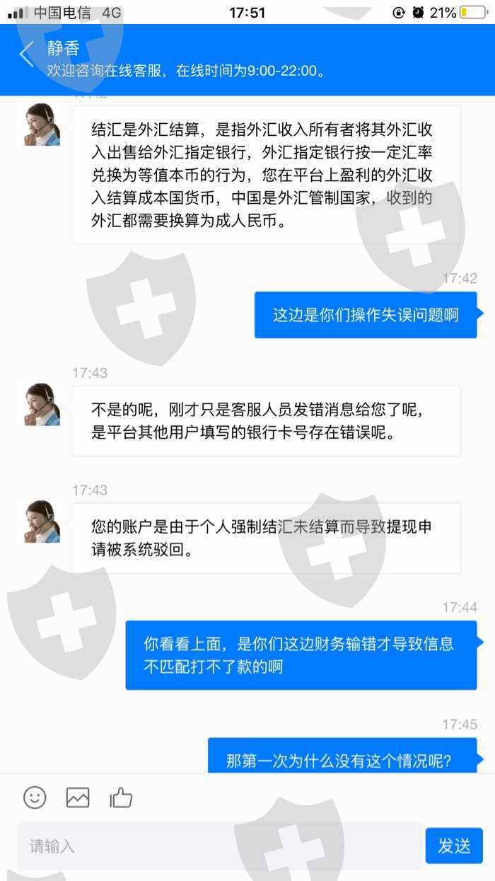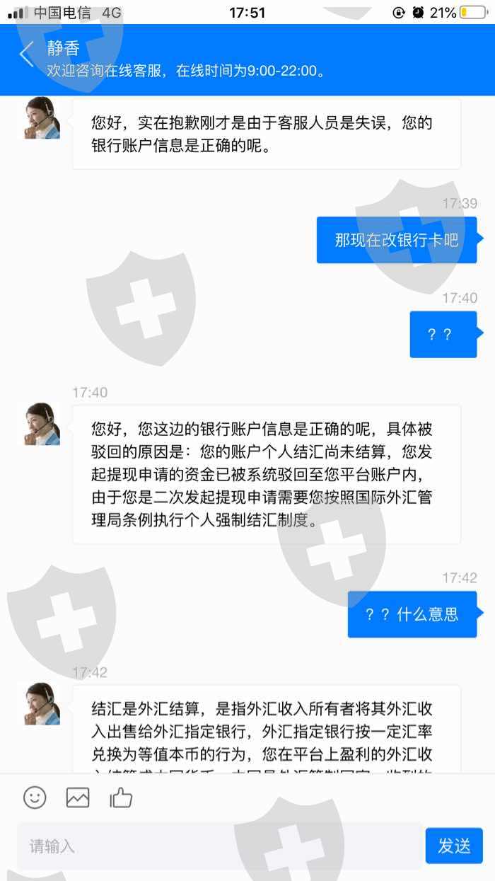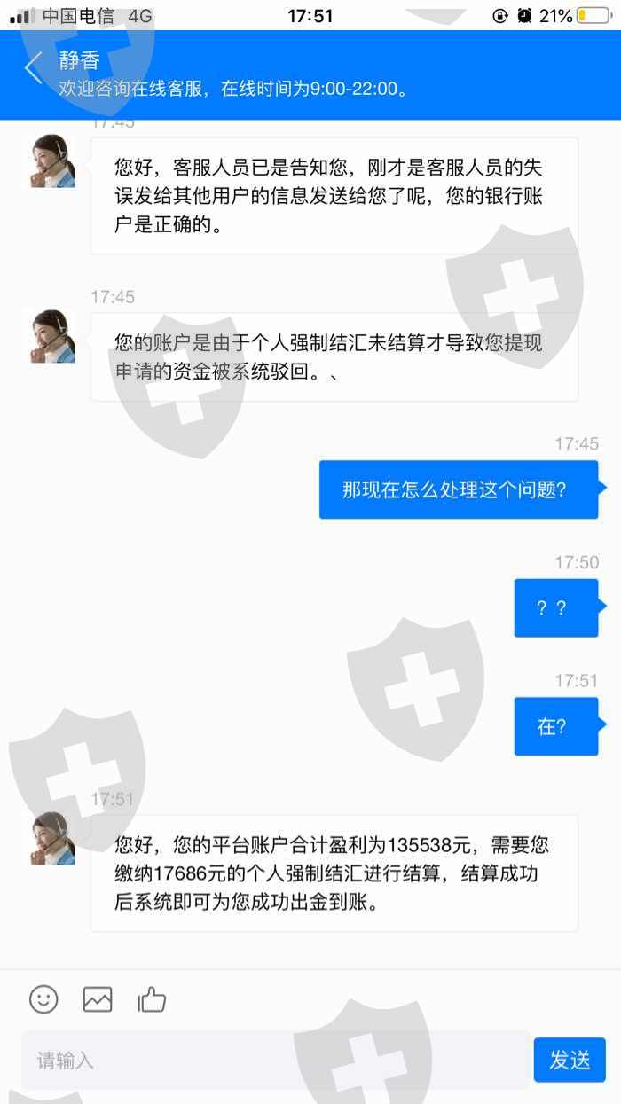 前天提现的时候说我账户系统审核超时要延迟到账驳回,根本就没有超过24小时,客服叫我重新提现然后我第二天又提了一次,就昨天找各种理由借口说我这边账户银行卡信息不对,驳回,又说客服发错信息了,之后又说我这边要个人强制结汇进行结算,要缴纳17686才能出金,这根本就是骗人的,充值还是打的个人银行卡账户,不是打到平台或者支付第三方