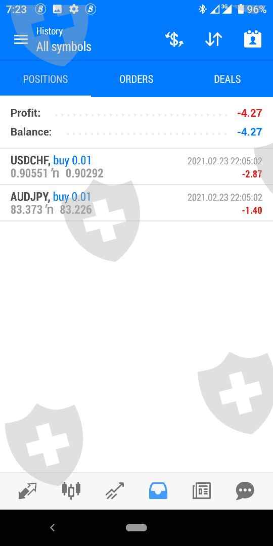 In the pictures below, I took a buy position on USDCHF on the green line and my stoploss at the redline but my account of $4 was wiped even though my stoploss was hit on AUDJPY for a -$1.40.
