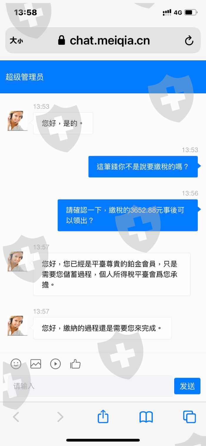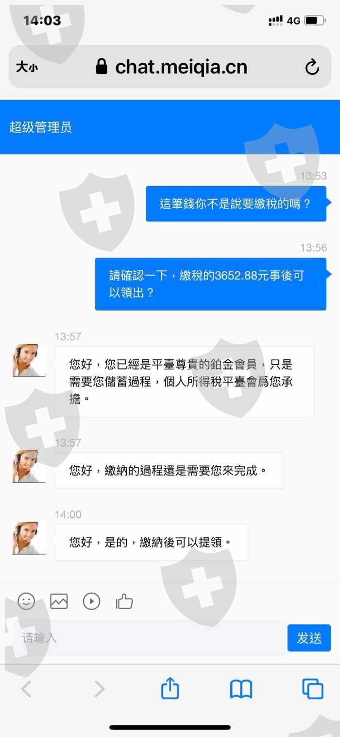 我最後要提領,結果過了24小時後,又出現要交保證金問題,客服和你要賬號都不算什麼?沒有到戶頭這才是重點,第一次小筆金額1萬多台幣可以拿到,後續,不管加入什麼會員,儲值多少錢領不出來,保證詐騙,dianyi728@gmail.com與我聯絡