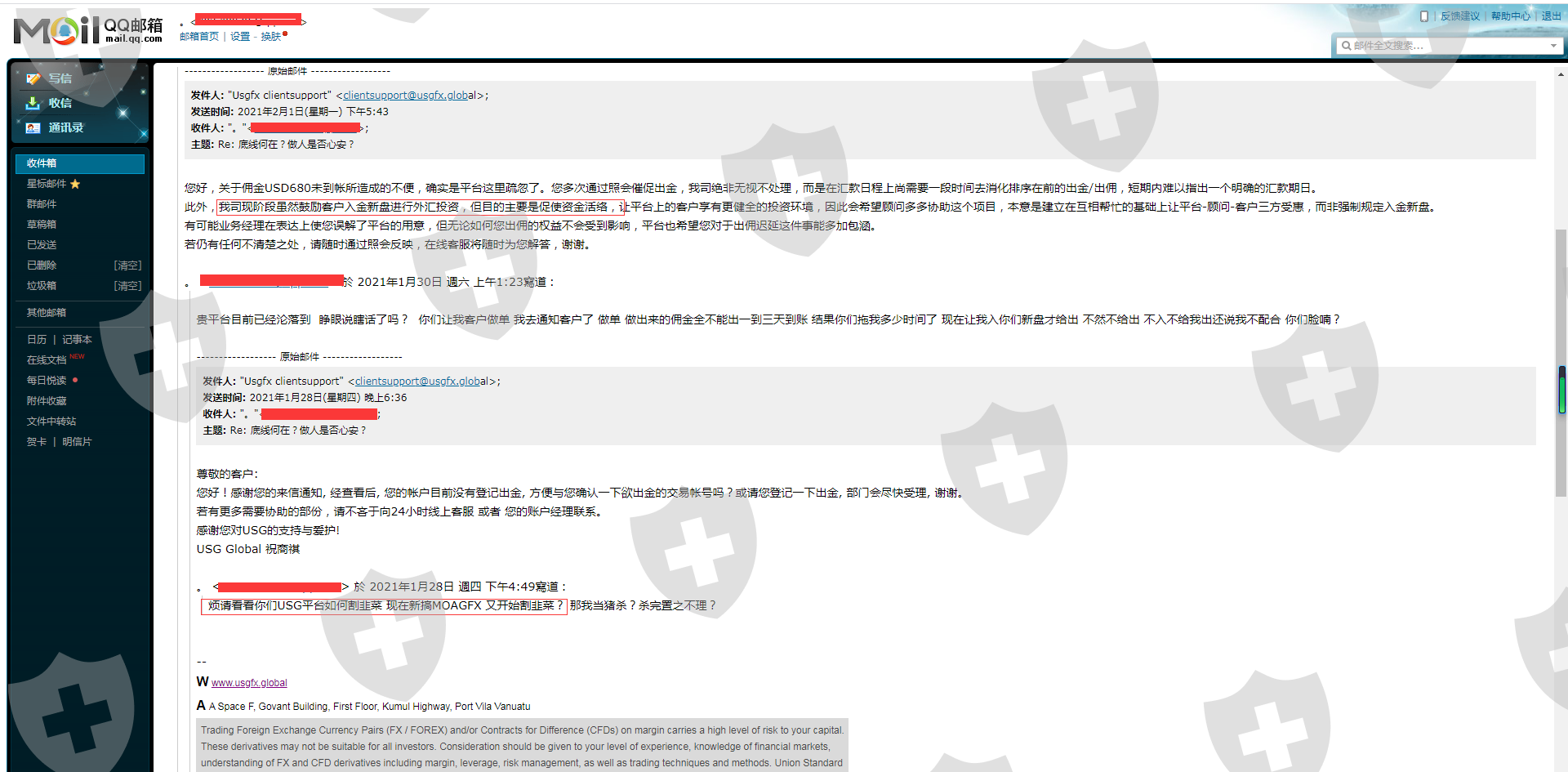 实锤 USG邮件回复:为司现阶段虽然鼓励客户入金新盘进行外汇投资,但目的主要是促使资金活络。概括一下就是USG没钱了 现在为了更好的骗钱推出MOGA。