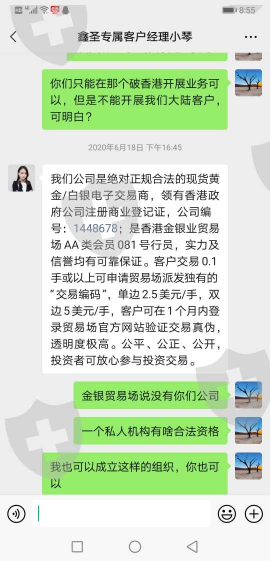 我在你们公司从去年下半年开始共计亏损9000美金,我希望你们能把我的血汗钱退回来给我,否则我会安排更多的受害者来找你们,把你们所有的涉案银行卡先冻结,或者提交警方冻结,把你们所有的支付通道包括和你们合作的第三方公司全部打击取缔。你们这些诈骗公司诈骗我们大陆客户,勾结所谓的 洗钱团队将我们的血汗钱据为己有,所谓的香港金银业贸易场只是一个私人机构有啥资格说你们合法,我现在就想拿回我的血汗钱,拿不到我可以不要 但是也绝不让你们好过,胆敢再欺诈我们大陆同胞 ,我会动用一切可以用的手段来对付你们这帮垃圾骗子!
