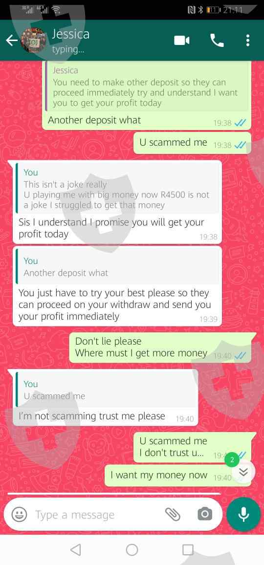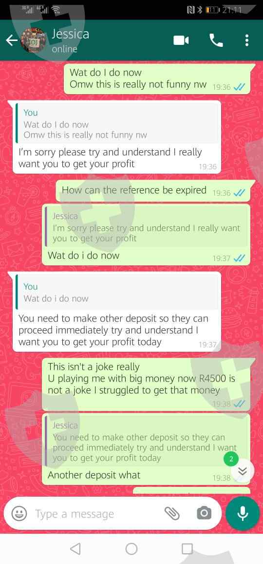 他们要求我存入500欧元以清除利润。当我这样做时,他们告诉我我使用的参考号已过期,并希望我存入另一个R4000,我已经发送了R8500。他们拒绝承担责任,因为他们没有发送新的参考号,这是他们的错,当“交易经理”说使用她发送给我的参考号时,这是标准银行Luno帐户。现在他们告诉我,因为它被发送到过期的参考文献中,这件事还没解决,而且他们拒绝还款