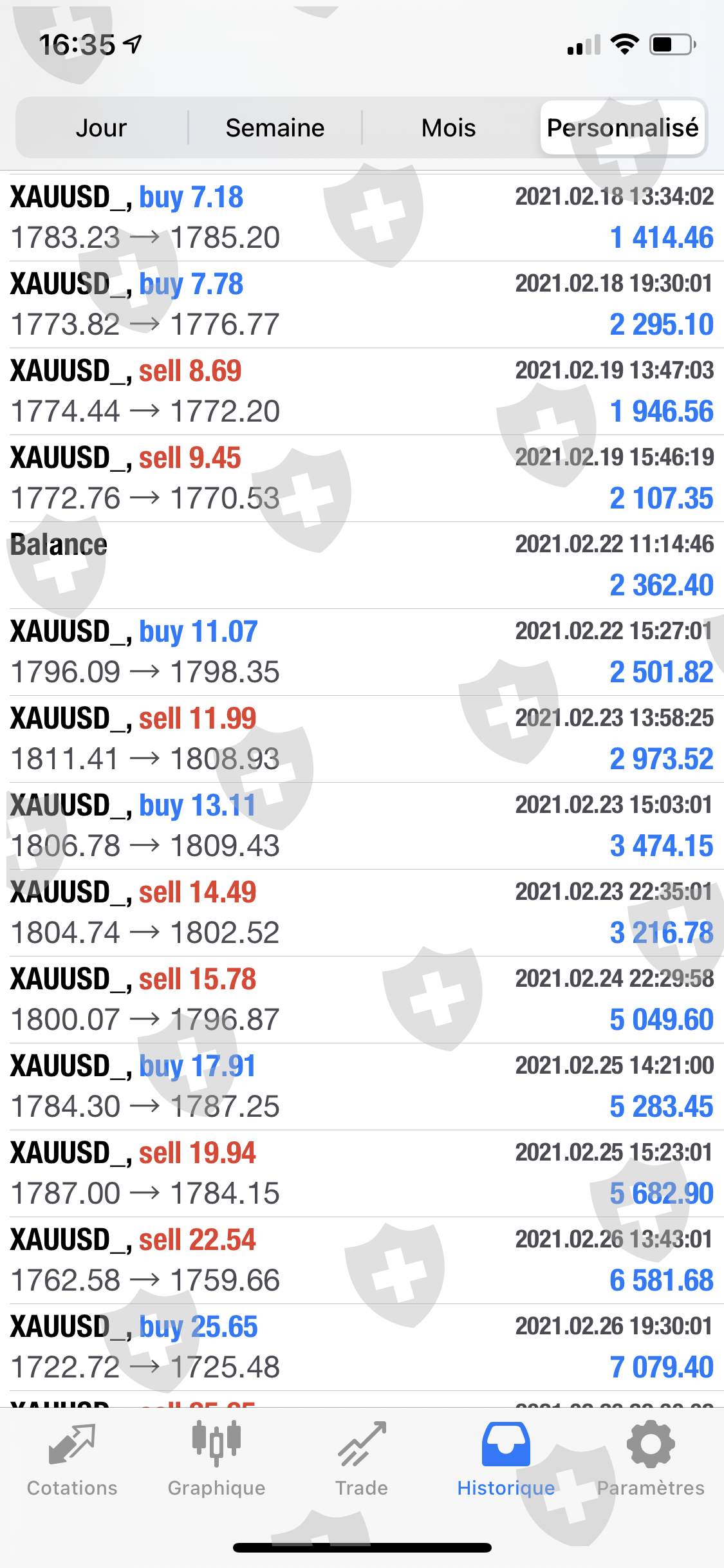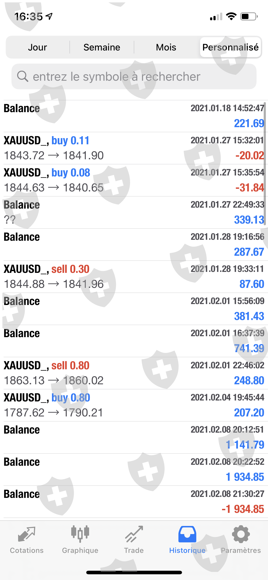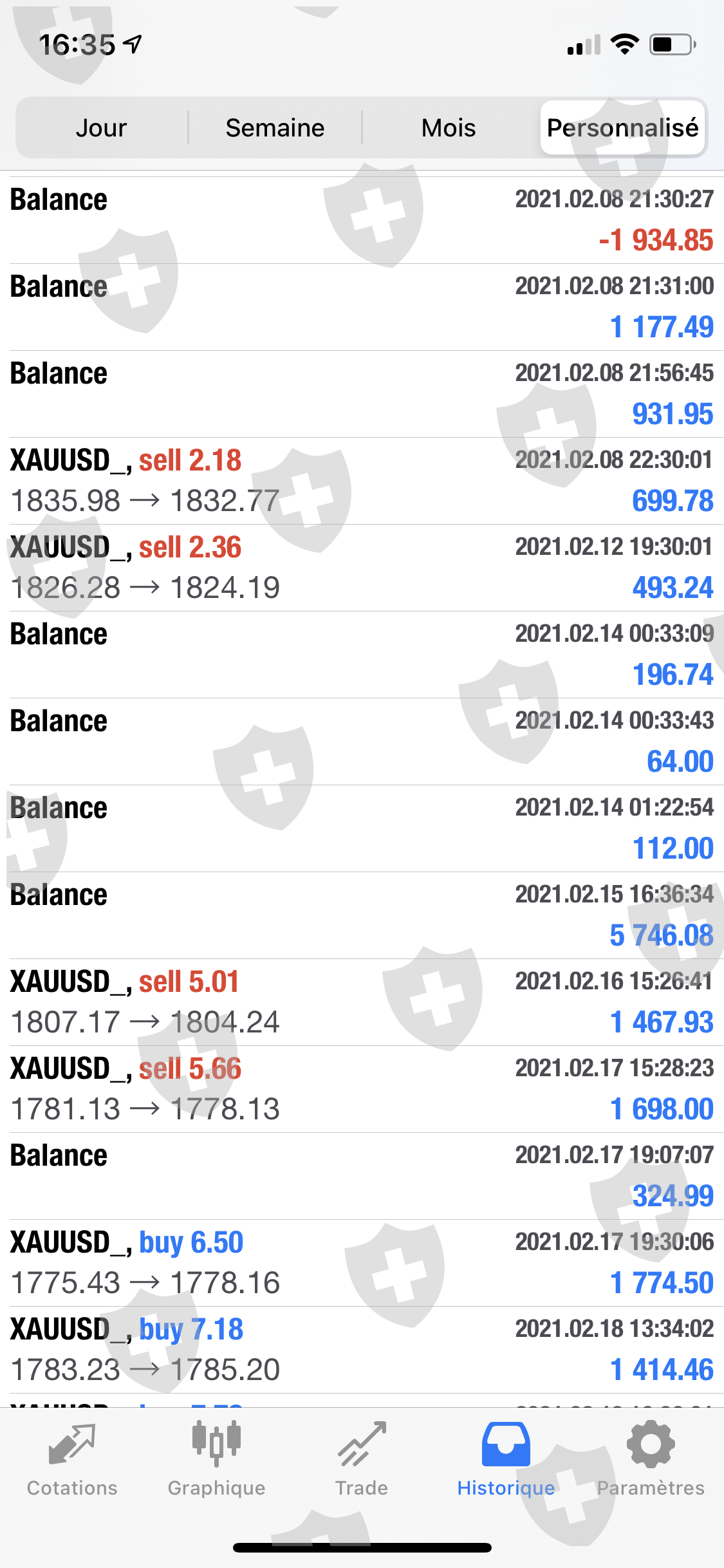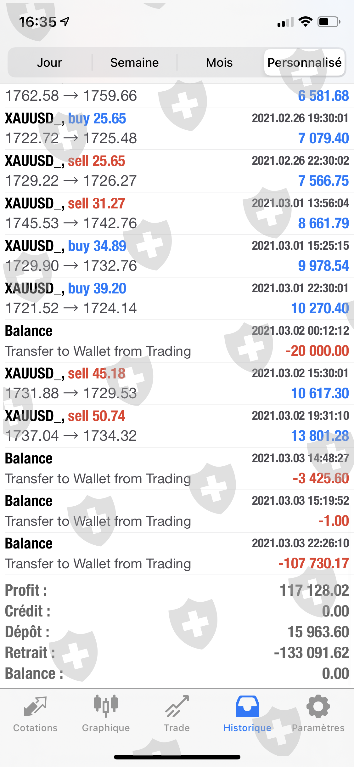 Une fois l'argent déposé dans le site du broker, il m'est impossible de le récupérer. J'ai perdu une somme d'argent énorme de 15 963.60 $ USD ! Sur l'application MetaTrader 4 (MT4) je pouvais voir mes soi-disant gains se fructifier grâce aux données que l'escroc m'envoyait : à quelle heure et minute précise de la journée il fallait investir (trader) sur l'or en dollars américains : XAUUSD. Il fallait soit acheter soit vendre sur le XAUUSD (buy/sell blue ou buy/sell red).