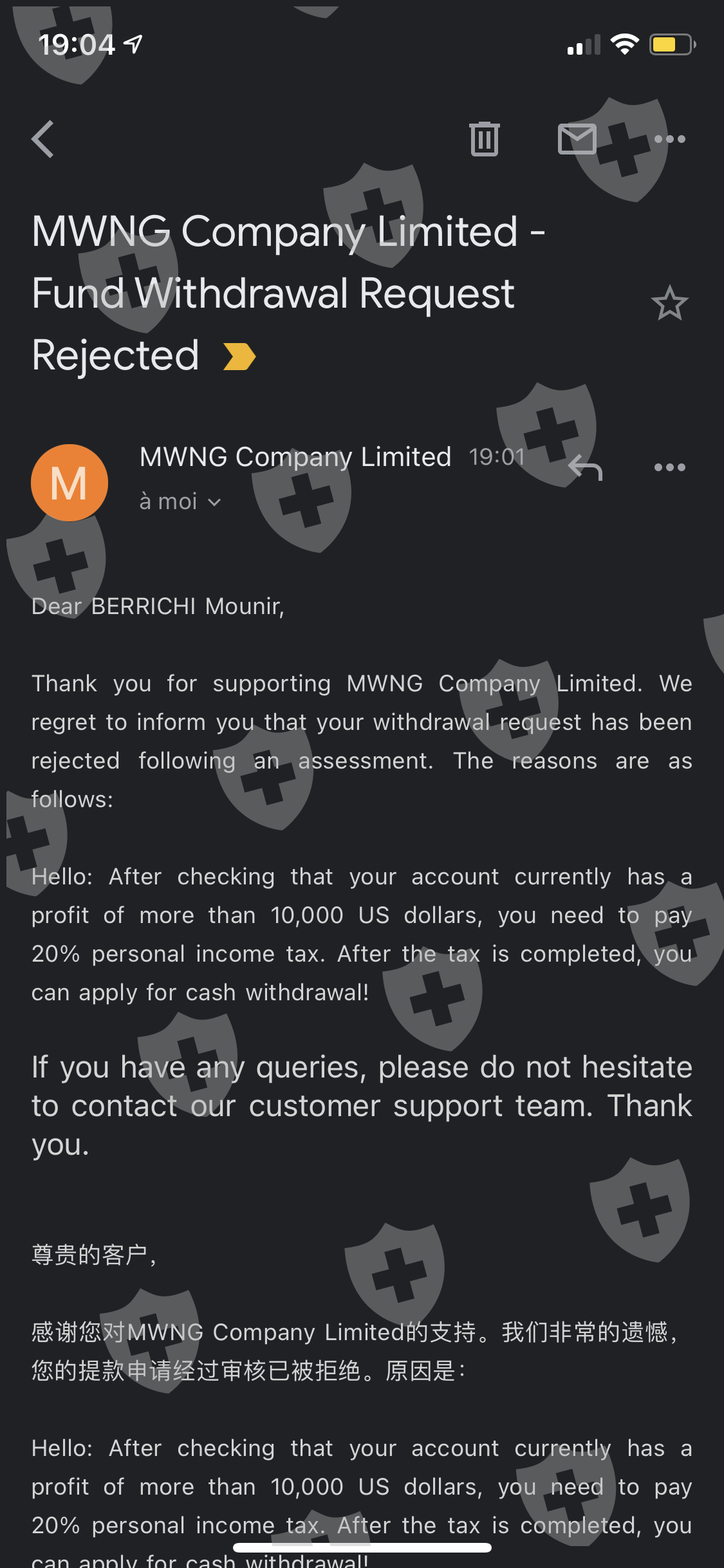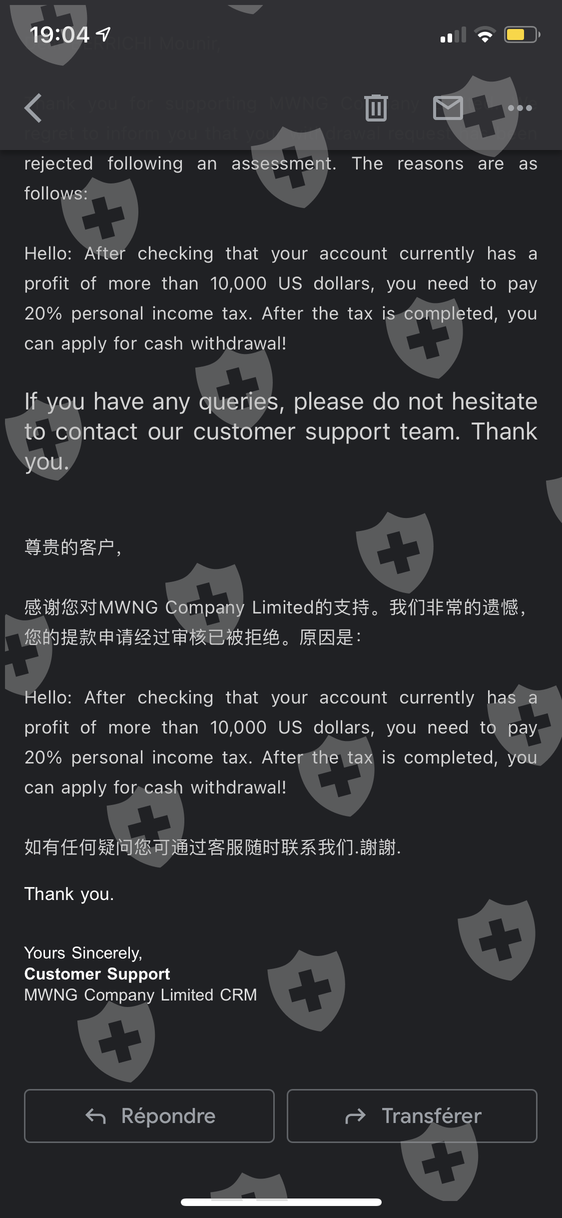 钱一旦存入经纪人的网站,我就无法收回。我损失了高达15,963.60美元!在MetaTrader 4(MT4)应用程序上,由于骗子发送给我的数据,我可以看到所谓的收益正在增长:我必须在一天中的确切时间和分钟在哪一天的精确时间(分钟)投资美元(以美元计)黄金黄金: 。您必须以XAUUSD买入或卖出(买入/卖出蓝色或买入/卖出红色)。