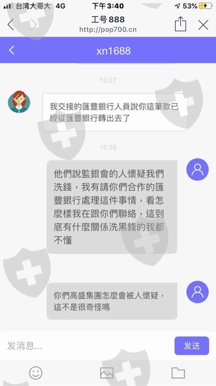 高盛國際利用網站平台詐騙,自稱是香港滙豐銀行辨理高盛委託滙款業務,先索取5%的手續費,再以洗黑錢罪名要求繳付20保證為由一再向我付款
