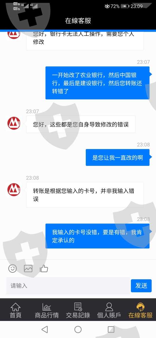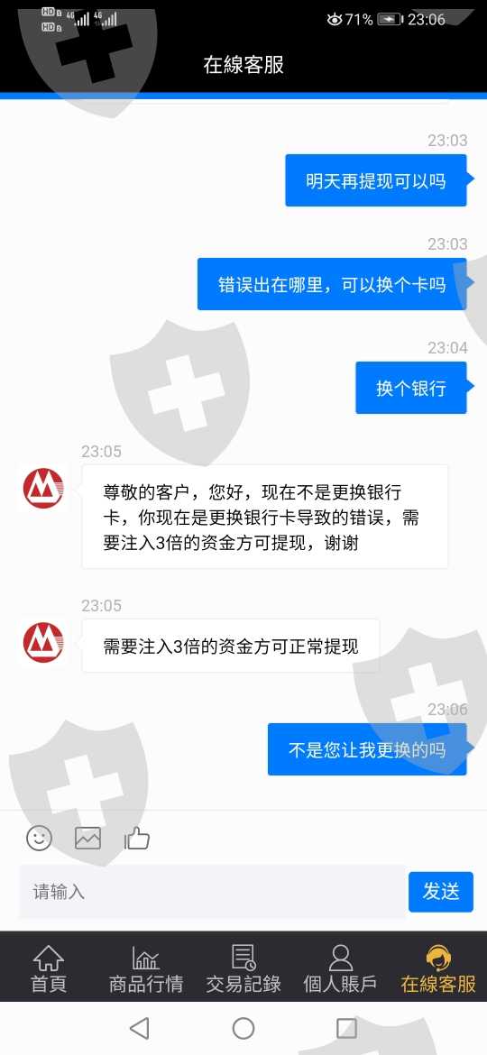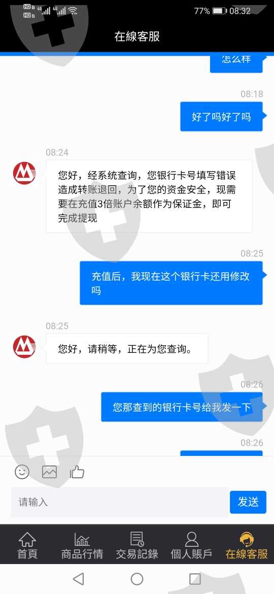先是要求变更银行卡,然后说变更失败,到第三次变更完了,转账时把银行卡故意弄错,然后不让提现,说要交三倍保证金,我也是醉了,我昨天晚上十点变更得银行卡,截图转账日期居然是昨天下午三点多,第一次玩外汇。投的也不多,主要是注意警惕