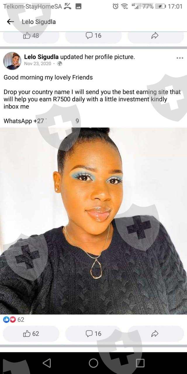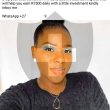 This lady (not even sure if it's a lady or what) on FaceBook she posed as Christian. She soften as if she is a Christian and she can help me to earn more with little investment. We spoke and she told me she is an investment manager, she assisted me by setting up a LUNO app, not realising that she was doing her own thing. Eventually fall for the trap, end up paying my money, but when it was time to cash up, she said I cannot be able to withdraw cause she gave me a wrong address, can't reverse it.