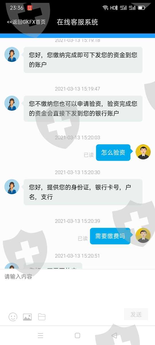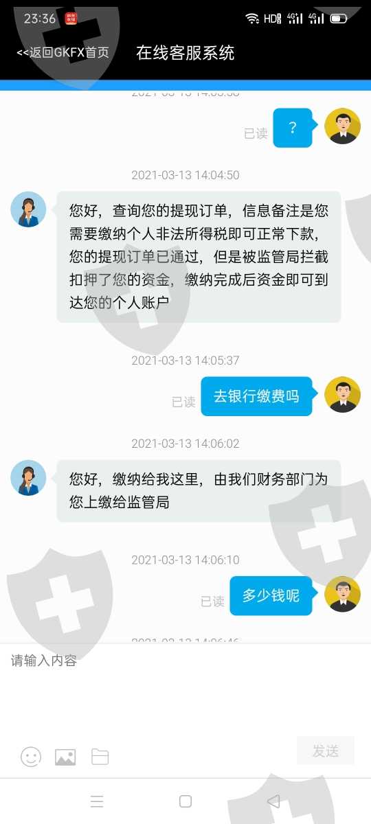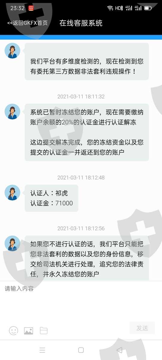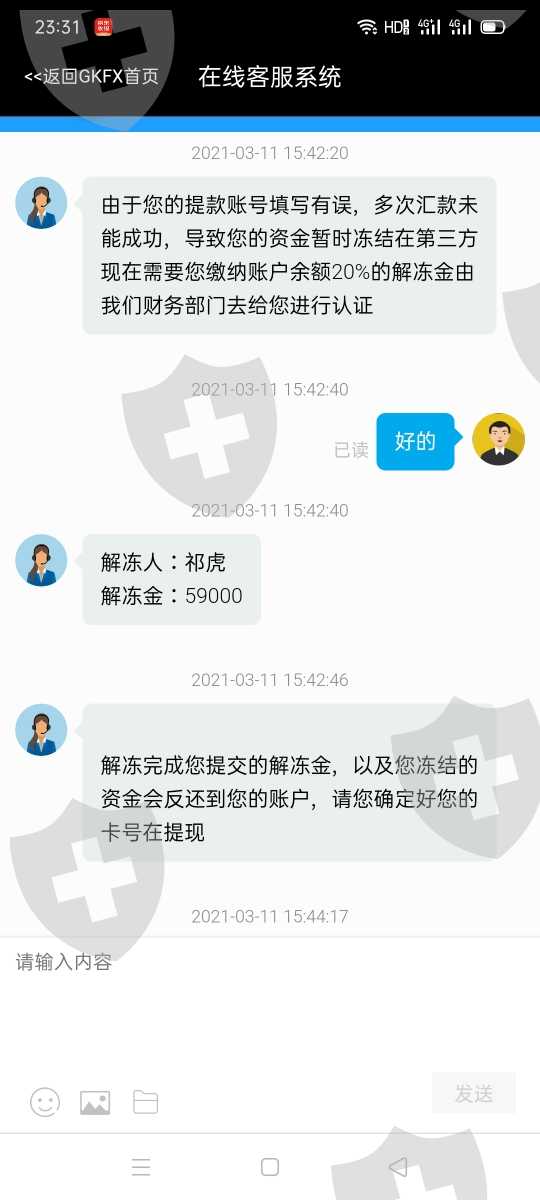 我在GKFX捷凯金融无法出金,第一次提现的时候说我银行卡号填错了,资金冻结在第三方,需要五万九的解冻金(还是提现不了)。不能提现之后第二次说是需要实名认证,需要把身份证正反面和手持身份证照片发过去,还需要缴纳一个认证金(七万一),缴纳之后还是不能出金。第三次说是因为多次操作涉嫌违规操作,需要缴纳保证金五万九,缴纳之后还是不出金,第四次说是监管会监察说是(非法个人所得税)需要缴纳七万一(没有缴纳)。客服说你不缴纳非法个人所得税有另一个办法,需要香港监管局验资需要银行卡号.姓名.身份证号.银行卡开户行地址。