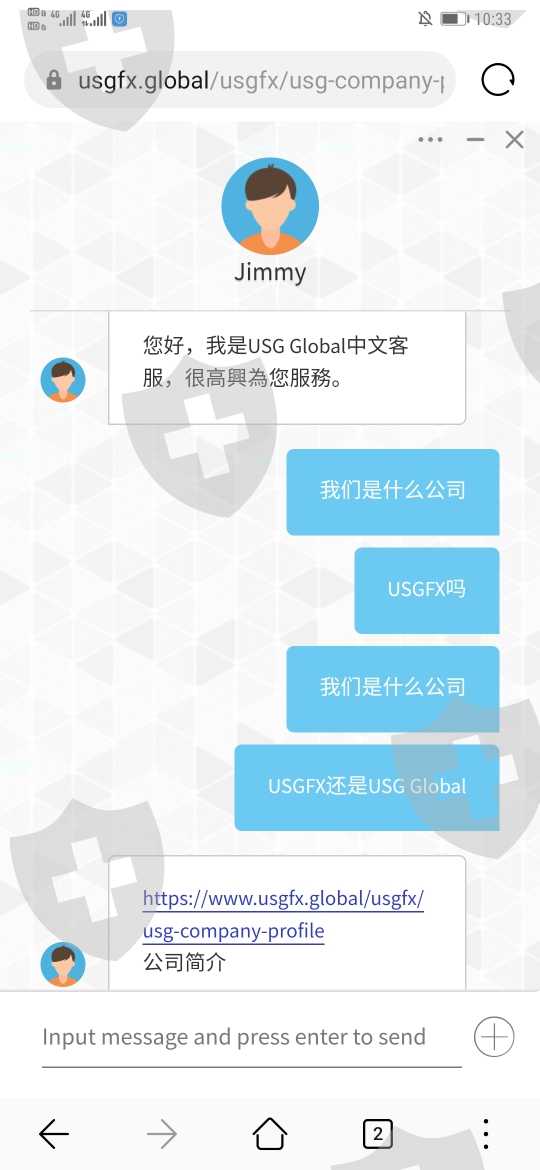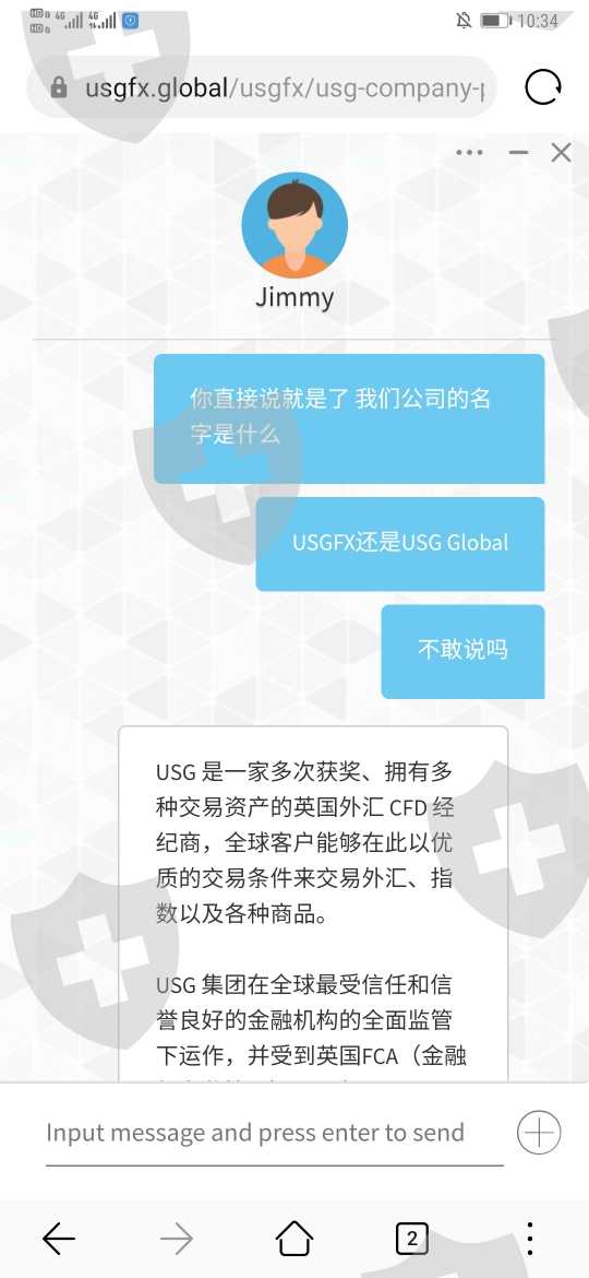 然后我将与平台客服对话的部分内容给大家分享,问他自己是哪一家公司,都支支吾吾不敢说话,不知道自己是USGFX还是USG Global。但是一开始他自我介绍说是USG Global。