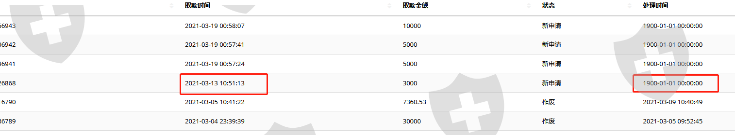 2021年3月4号就开始申请出金,一直出不来。负责的人说是出金额大,让小笔小笔的出(比如说2000或者3000),相信了她说的话,他让后台取消了我的申请,(取消出金申请反应特别迅速!跟处理申请时间简直成反比!)随后换成小笔出金,结果又一个星期了,一分小笔资金也没有出!从2021年3月4日开始到今天3月19日,至今一分钱都没有出!后台显示处理出金的时间是1990年1月1日!!!大家一定擦亮眼睛!!!IMF无法出金!!!