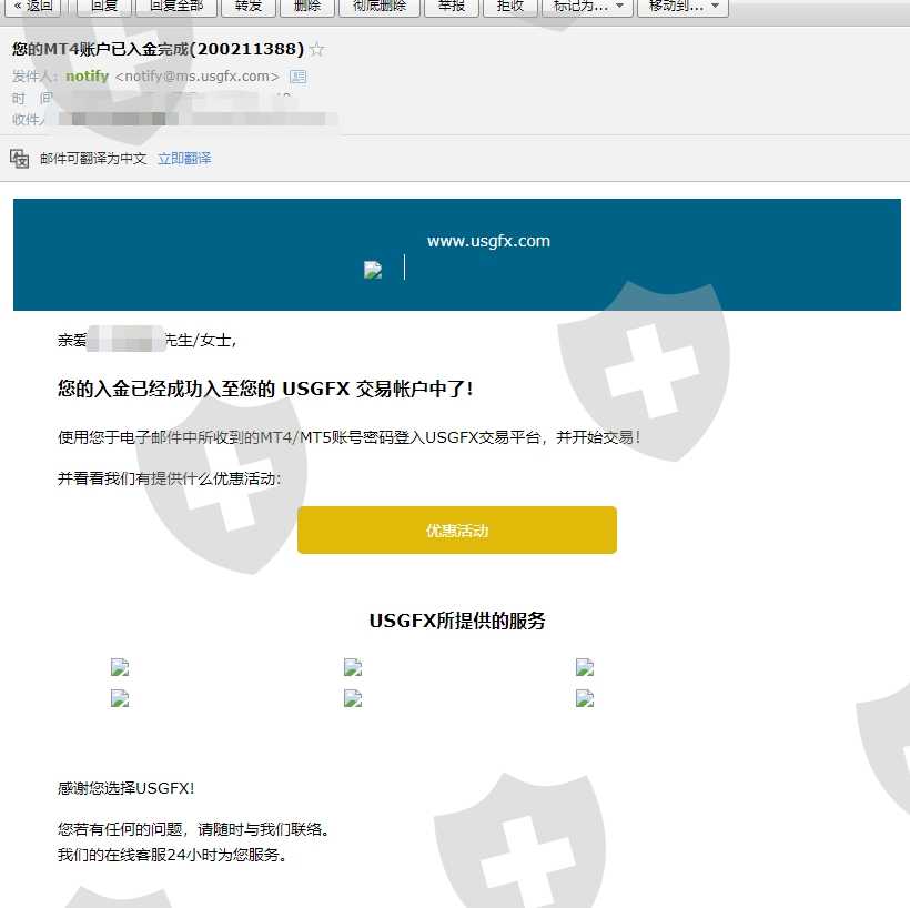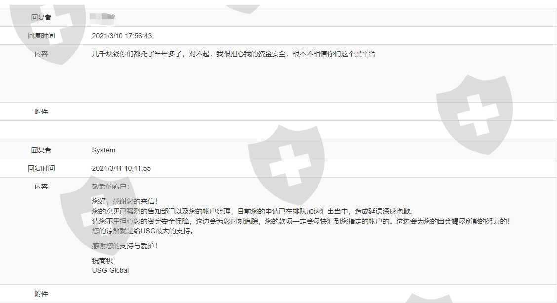 USGFX无法出金 从2020年4月开始在usgfx入金开始操作一直到九月份客户经理提醒说平台监管出现问题开始申请出金,但是每次申请都石沉大海,只有机器人自动回复各种加急处理,也没有任何官方工作人员联系过客户,两个账户的钱半年多始终无法到账