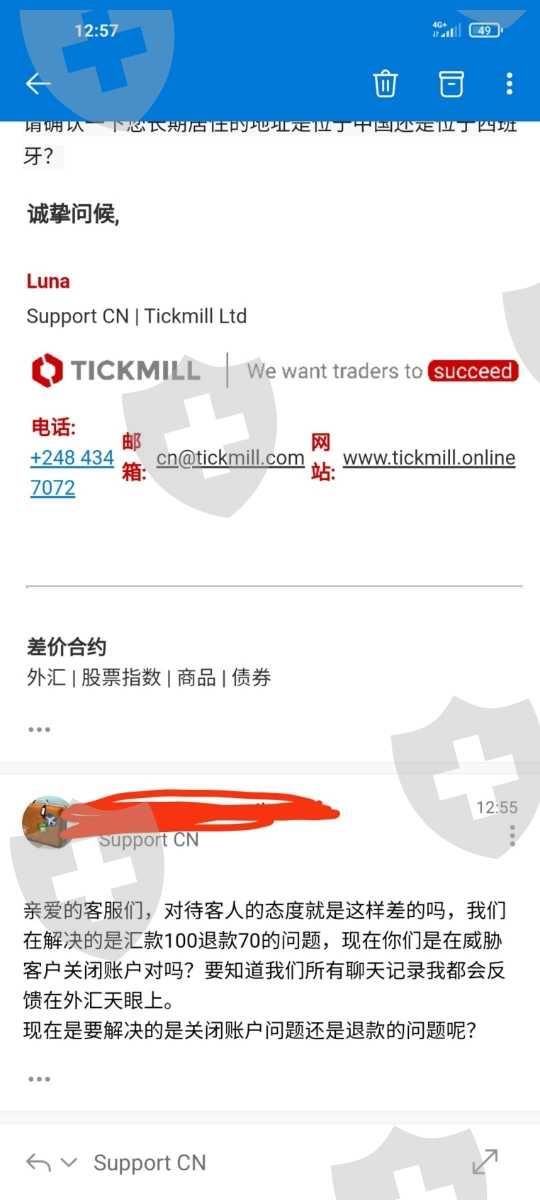 之前呢因为汇款100却退回70争论到现在没有解决过程我不说了到了最后客服估计是烦死我了,转移话题问我ip.为什么在国外。搞笑的是注册一年了没问我,现在要解决问题被烦到了开始威胁客户关闭客户账户。在我认为tickmill客服售后缺乏专业性,态度也不好。如果想要使用他们家要做好被气死准备