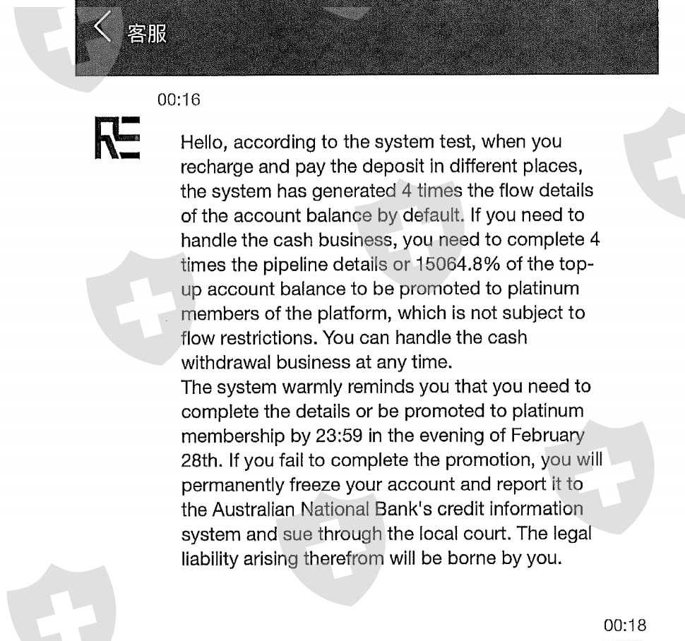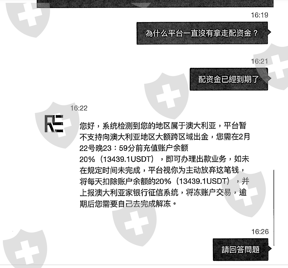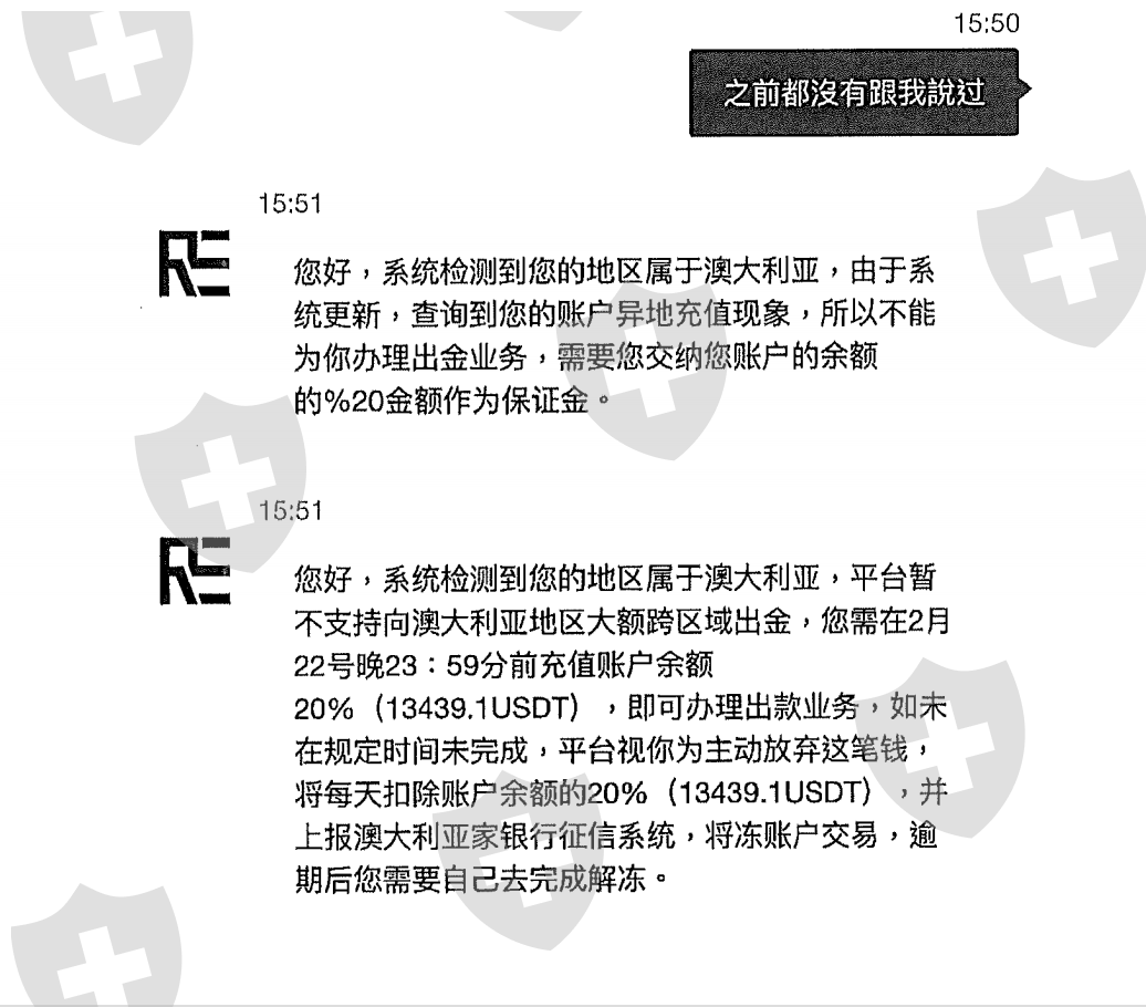 RE告诉我,他们有促销分配贷款的方式,他们将提供$ 30000USDT的贷款,但条件是我必须将相同的$ 30,000 USDT存入该帐户。我已申请接收此报价。在申请时,我的帐户中已经有$ 7,483.93 USDT,除了我必须在帐户中存入$ 30,000 USDT之外,没有其他任何有关此要约的信息。只是在我的申请获得批准后,他们才告诉我,我需要在21年2月21日下午11点59之前将30,000美元存入我的帐户,其中不包括我已经存入的7,483.93美元。当他们表示如果我不再存入$ 30,000时,他们每天会从我的帐户中扣除20%并向澳大利亚银行委员会报告,这可能最终影响我的信用评分,但我在存款之前已经开了口,我对此表示怀疑与Financialrecovery.tech合作调查RE的案例。在21年2月15日,我联系了RE并要求从我的帐户中提取$,我被告知RE不支持从澳大利亚的存款和取款,我需要向我的帐户中充入$ 13,339 USDT作为“保护性存款” '占我帐户余额的20%。