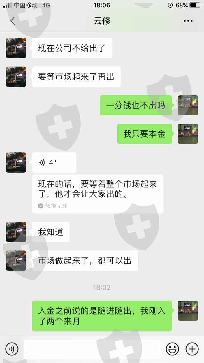 入金时承诺随进随出,出金手续费百分之五。我入金才两个多月,威世达就拒绝出金。3月18日申请出金,六个账户,五万一千美金,至今一直不给出金,上级说是等市场好起来才给出金。上级的上级是范佳佳,多次微信联系,一直不回复。