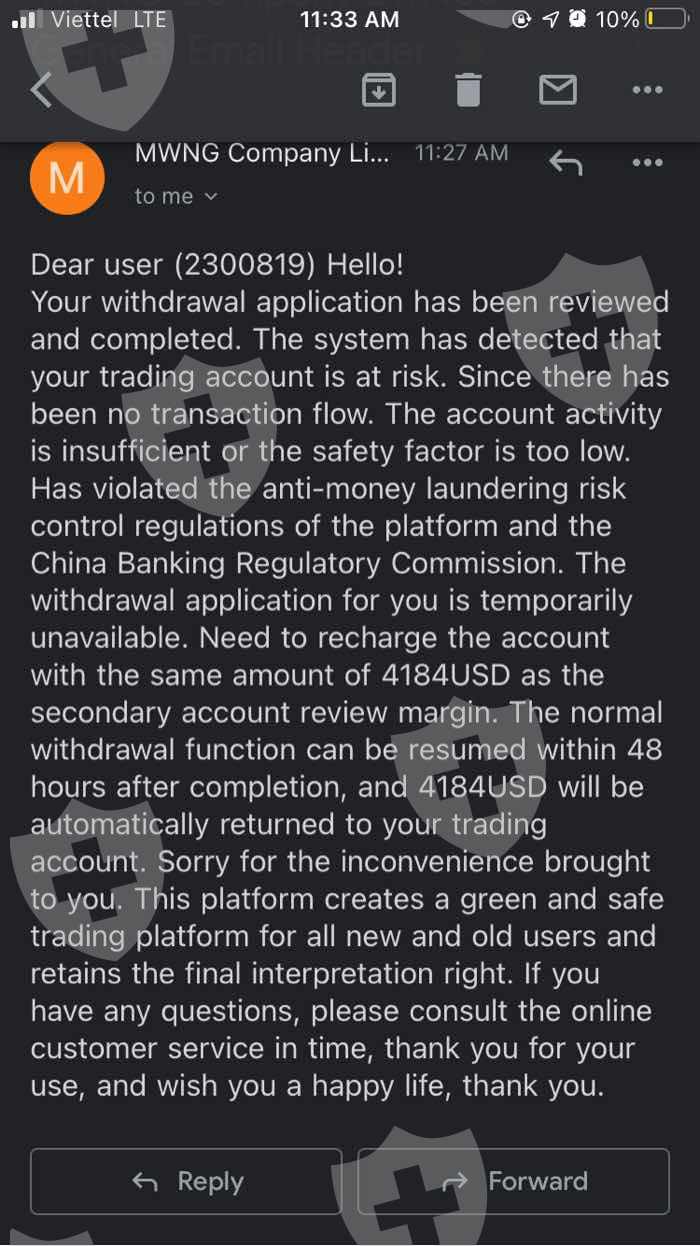 I deposited $5,000 here and after a while, I wanted to withdraw some of the money but they said my account was suspected of money laundering and requested to deposit an additional $4,200 for verification. If I do not make this deposit, my account will be frozen and I lose all original funds. Why is it so absurd? They said, I made too few transactions, but actually, I entered a lot of small deals everyday. My withdrawal was pending for 8 days and then the result is an unreasonable rejection.