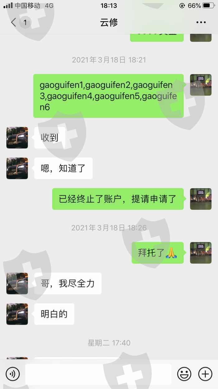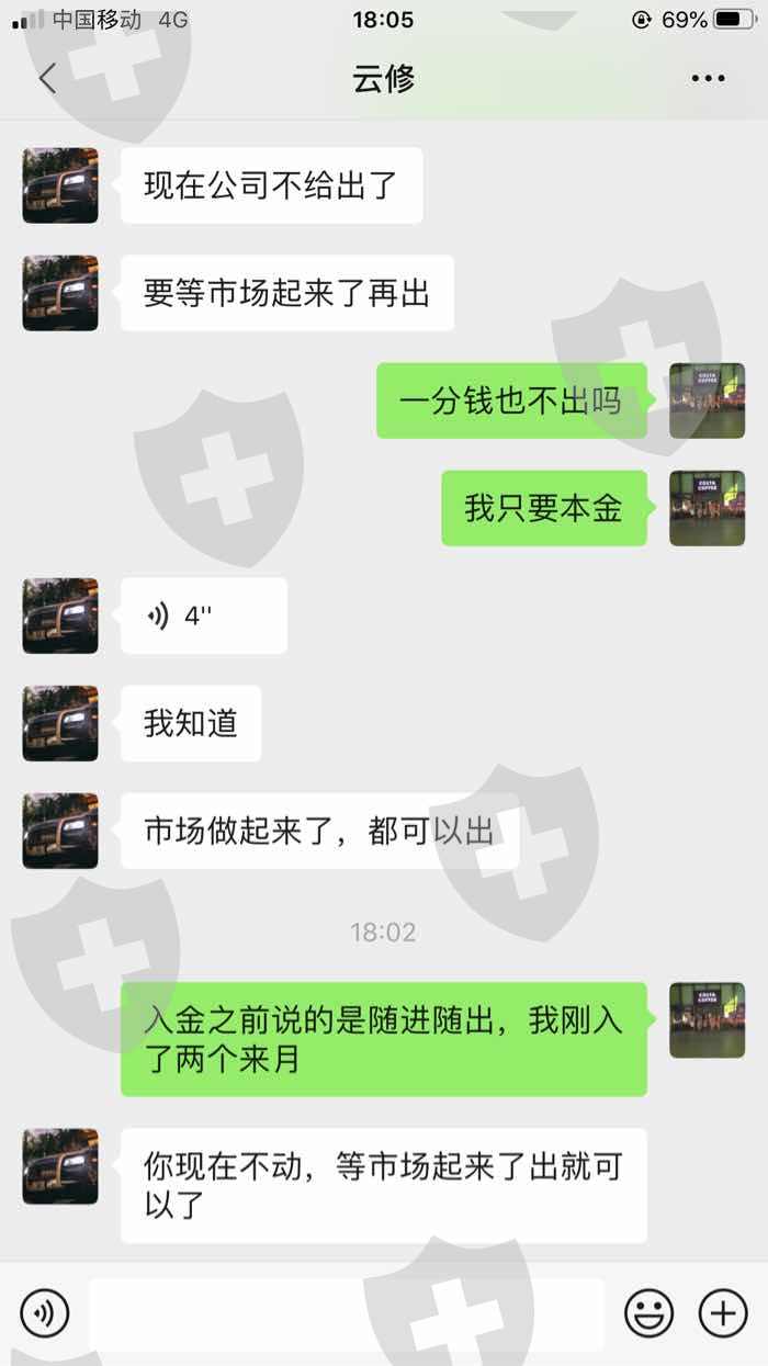 自3月1日开始,威世达一直拒绝出金,我们的直接上级是云修,他回复说必须等市场好转之后,威世达才给出金。上级的上级是范佳佳,多次微信联系她,一直不回复。