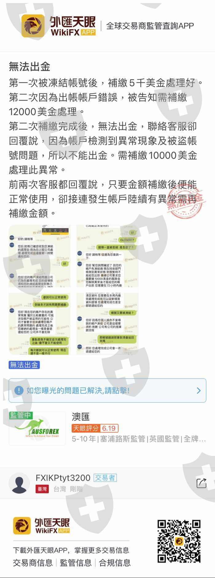 第一次被凍結帳號後,補繳5千美金處理好。第二次因為出帳帳戶錯誤,被告知需補繳12000美金處理。第二次補繳完成後,無法出金,聯絡客服卻回覆說,因為帳戶檢測到異常現象及被盜帳號問題,所以不能出金。需補繳10000美金處理此異常。前兩次客服都回覆說,只要金額補繳後便能正常使用,卻接連發生帳戶陸續有異常需再補繳金額。