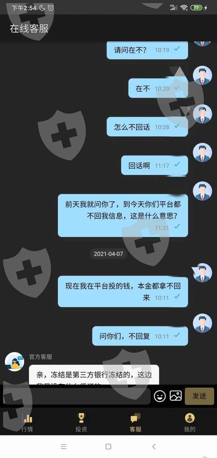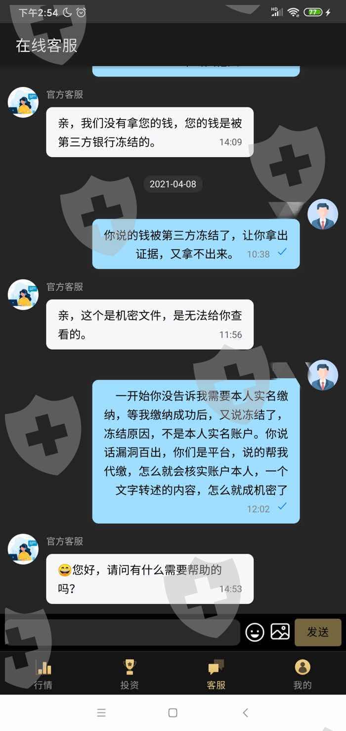 提现后告知要缴纳税,缴纳后核实到不是本人账户缴纳,第三方银行把钱冻结了,问客服漏洞百出,要不直接不回复,联系那个所谓的交易老师和他们团队销售员,不回复