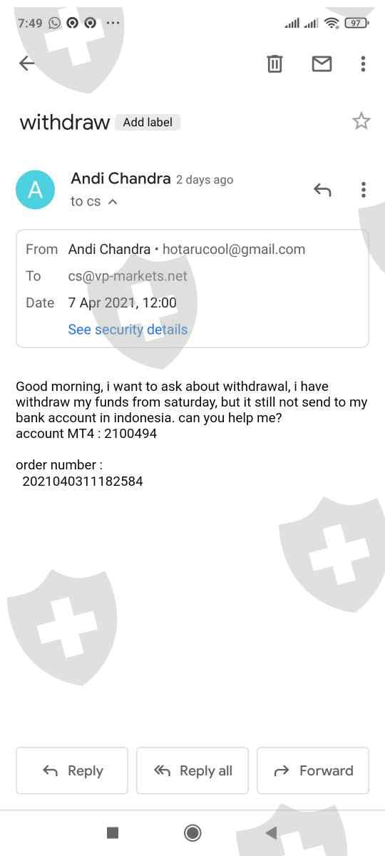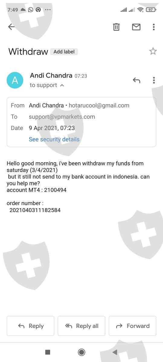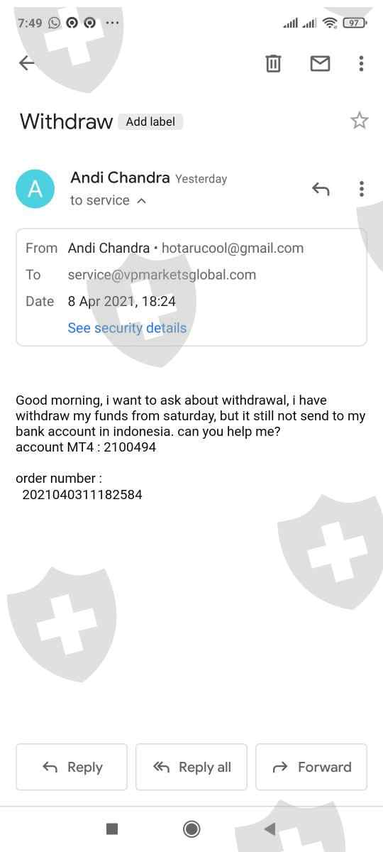 我已经从星期六(3/4/2021)通过电汇提取了大约733美元的资金,但仍未汇入我在印度尼西亚的银行帐户。我无法与CS进行在线聊天,但我已经发送了一封电子邮件以支持服务和其他电子邮件,但仍然没有任何回复。帐户MT4:2100494订单号:2021040311182584