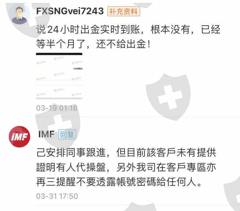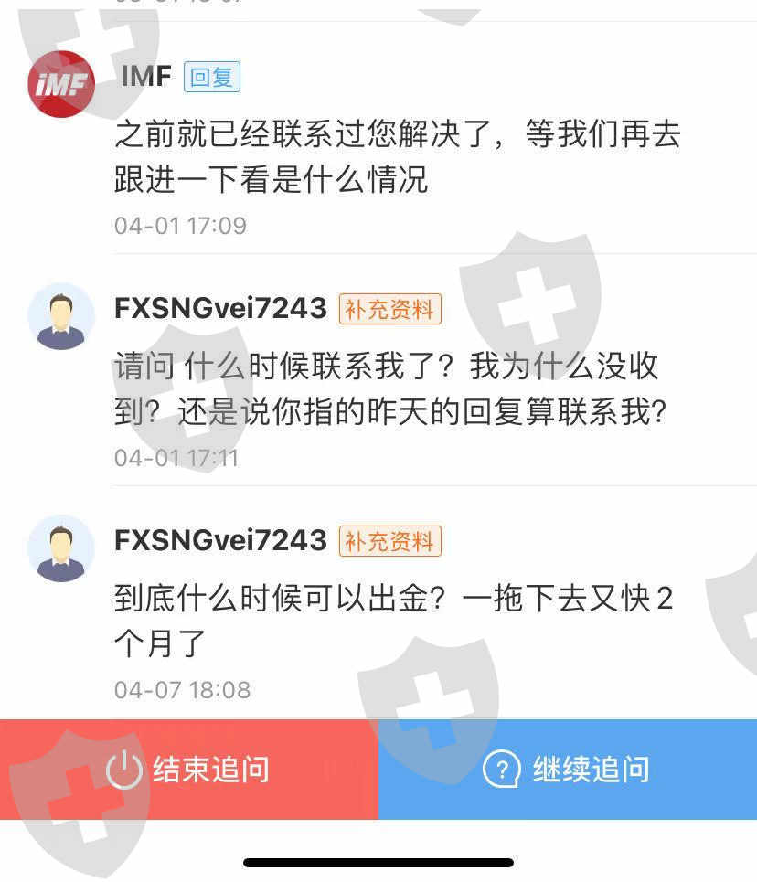 2021年3月19日再次提交出金记录,3月31日胡乱回复,扯皮,找不正当借口不出金,4月1日回复已经联系过我!!所以imf联系我指的是回复了我两句不出金的借口?在其他时间从未与我取得联系!!!出金申请根本自己取消不了!!到今天4月15日我突然想起来查看一下才发现被取消了出金申请!而且是在4月2号就取消了!邮件什么的都没收到取消通知!就是黑平台!客服电话也一直打不通!