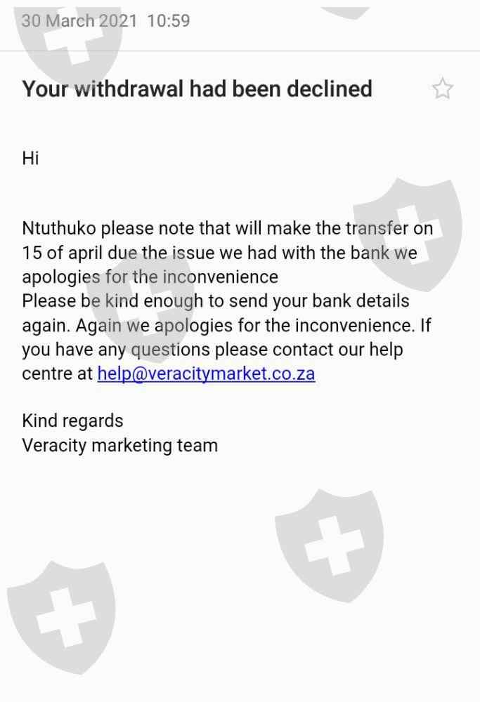 Veracity Markets has been keeping me waiting on my withdrawals, at first they said they changed the bank details.