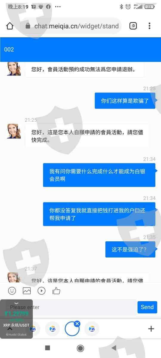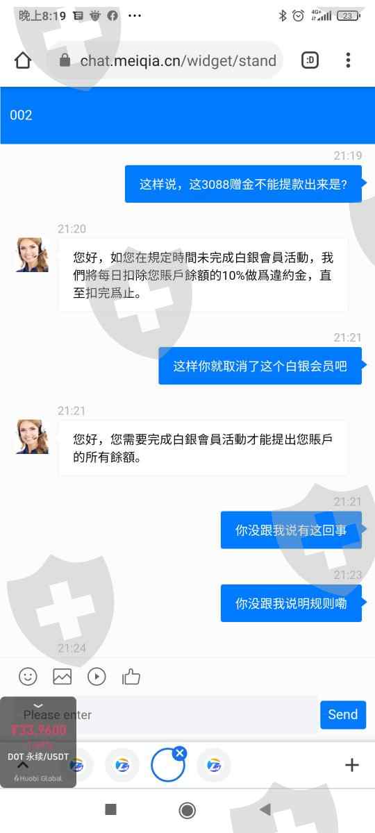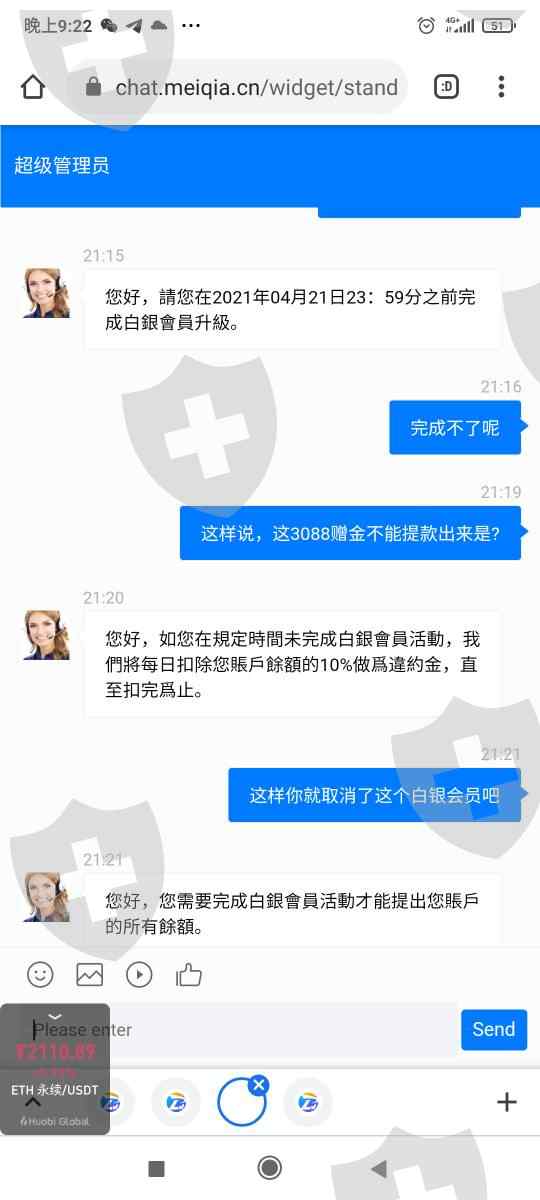 我问她白银会员需要完成什么才升级,她就直接升级了才说要在三天内入金满三万才可以提款出来。不入满三万就每天扣10%本金直到扣完为止。还不让我取消和提款。麻烦为我主持公道