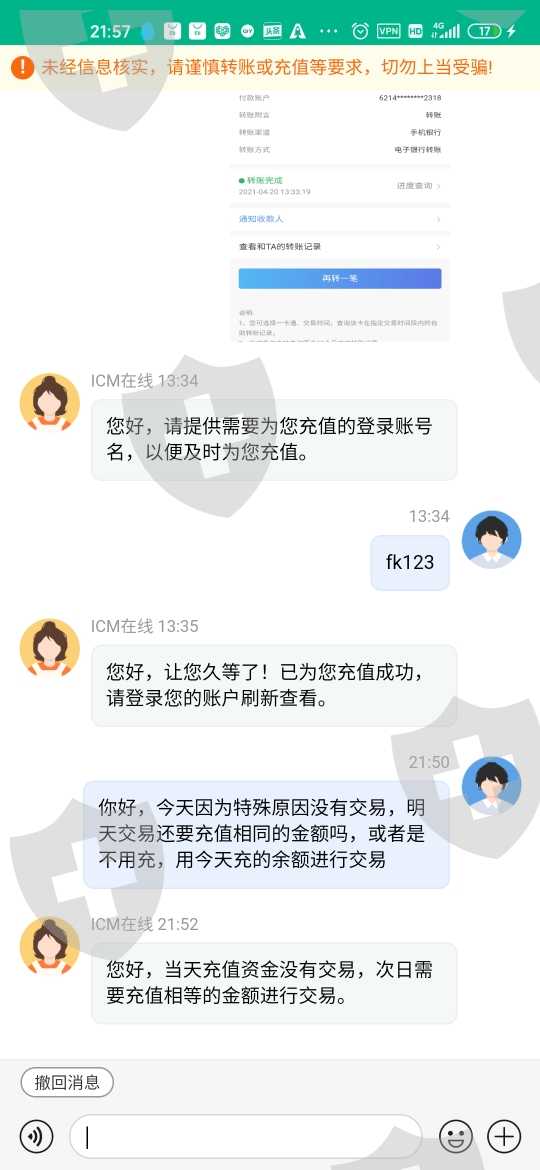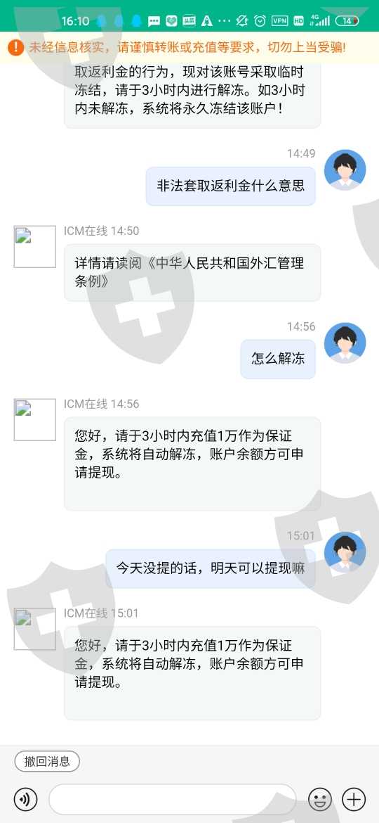 这几天被同事拉进一个外汇群,专门盈利平台分发的彩金,跟着孙磊指示,昨天投入1400被告知市场不稳定延后交易,一直拖到第二天,客服这边回复当天必须充值前一天相同的数值,结果又充了1400,最后总共2800,最后交易了,却提现不了,说是非法取返利金,要冻结