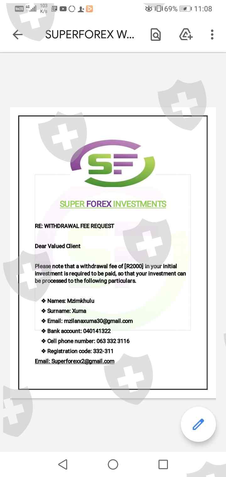 I started a short term Investment with super Forex investment with an amount of R1700 and R1500. The investment was supposed to be for 5 working days and 2 working days. Mr Madonsela said I should pay R4220 for release fee because it is compulsory, I then paid the amount. They he sent an invoice from fnb saying payment on hold, he asked me to pay R650 so that the payment can be released, I paid the amount then he just disappeared on me. Please help me to get my money back