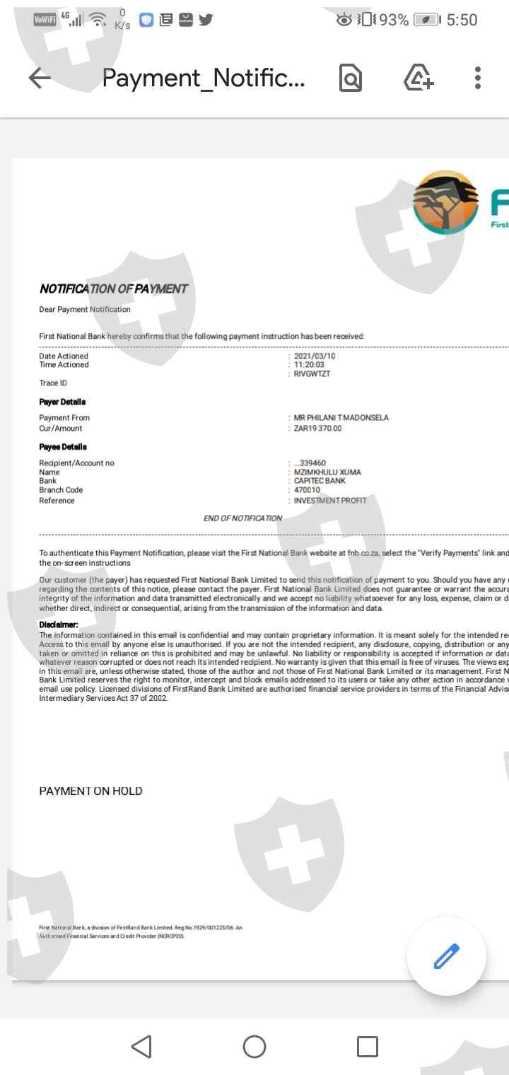 下午好,我开始了短期投资Super Forex投资金额分别为R1700和R1500。该投资原定为5个工作日和2个工作日。 Madonsela先生说,我必须支付R4220的放行费,因为这是强制性的,然后我支付了这笔款项。他们从fnb发送了一张发票,说保留付款,他要求我付款R650,以便可以付款,我付了款,然后他就消失了。请帮我取回我的钱