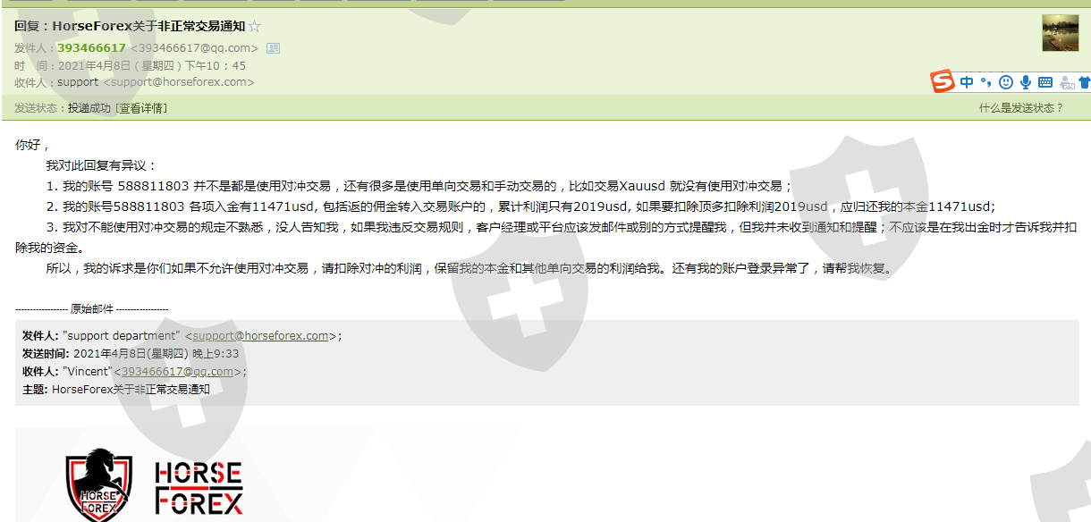 马汇Horseforex 编造理由不给出金,还封禁后台和交易账号, 还有12155.8 usd不给出金。发邮件不回,联系在线客服也不解决,从2021.4.08至今已有18天了,