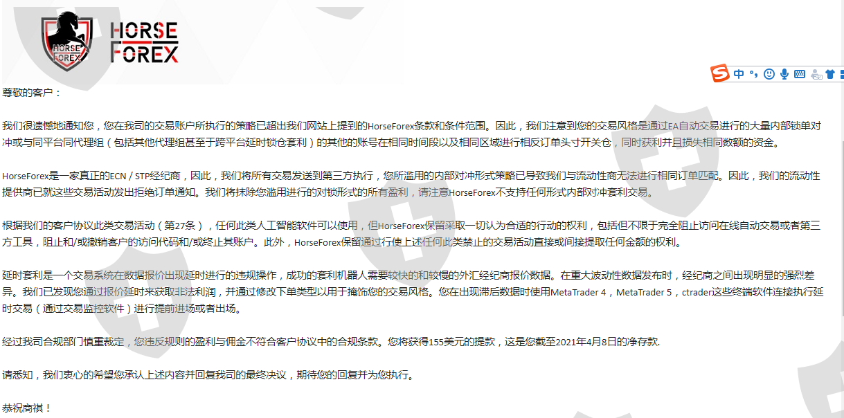 马汇Horseforex 编造理由不给出金,还封禁后台和交易账号