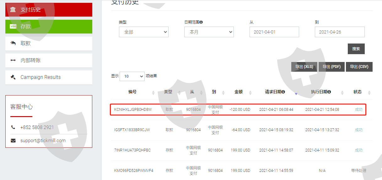 tickmill平台中国官网地址:https://www.tickmill.ltd/cn ,以前出金一直正常出金,口碑也不错,但最近一两次出金特别慢但是到账了,但最近一次21号出金,后台显示成功了 并正常从mt4账户扣款了 但是4个工作日了都没到账,时间也没多久,但是客服的反复失信让我有点怀疑:第一次是23日晚说当晚能到 ,第二次是26 日说晚上能到 结果没到 ,然后客服又说已经转账了 ,在给我索要回单 还是没给我回单,然后27号我再次联系的时候 开始是处于拉黑状态 后来我清理了缓存 换了一个浏览器 联系上客服,他解释说资金还是处于没到账状态;前面的三次失信且自相矛盾,让我不得不怀疑平台是否给我正常出金