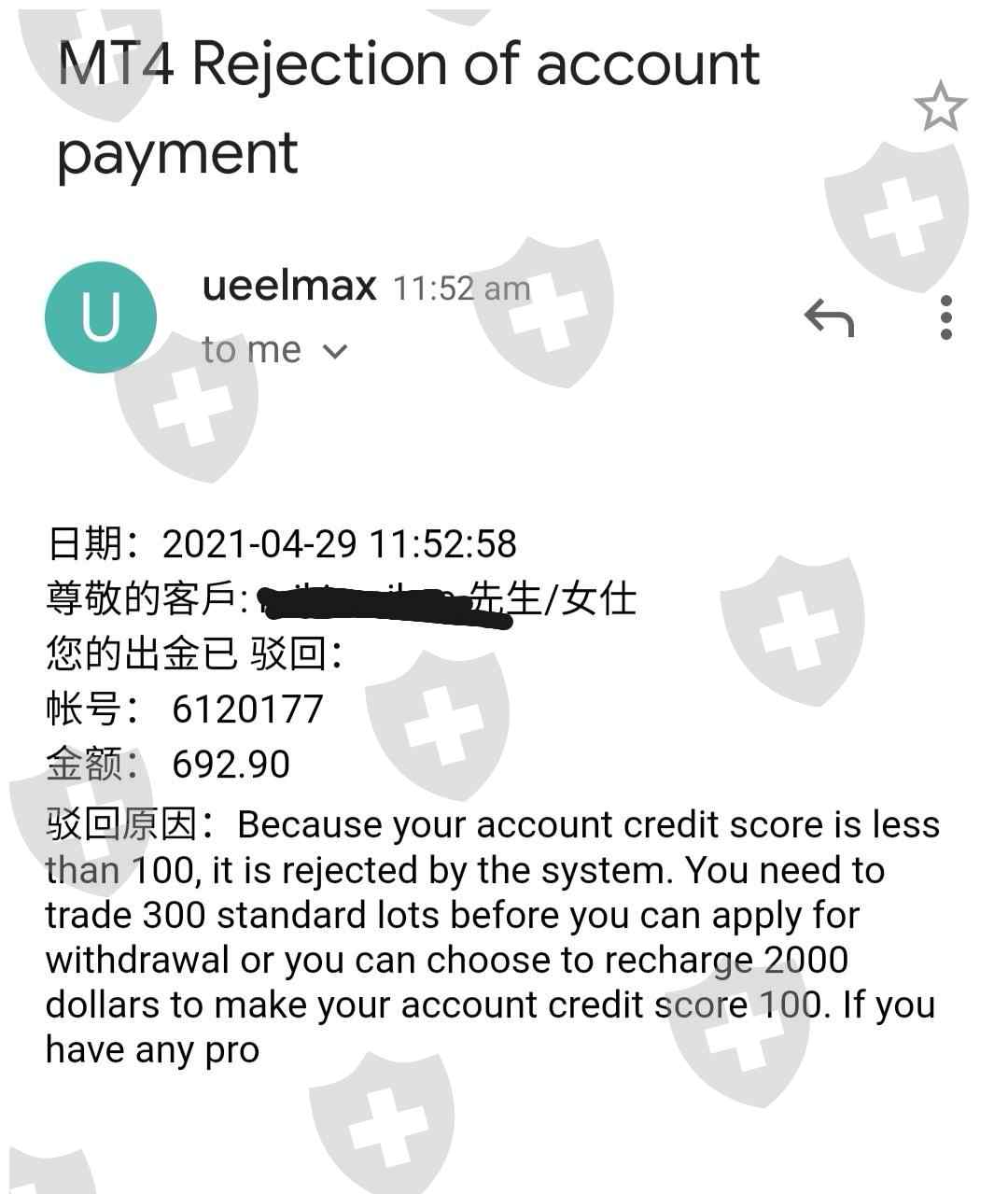 大家真的要小心这个平台,第一次说资金不符reject了,第二次就说要多过100的分数才可以出金,不然就需要再入金200美元