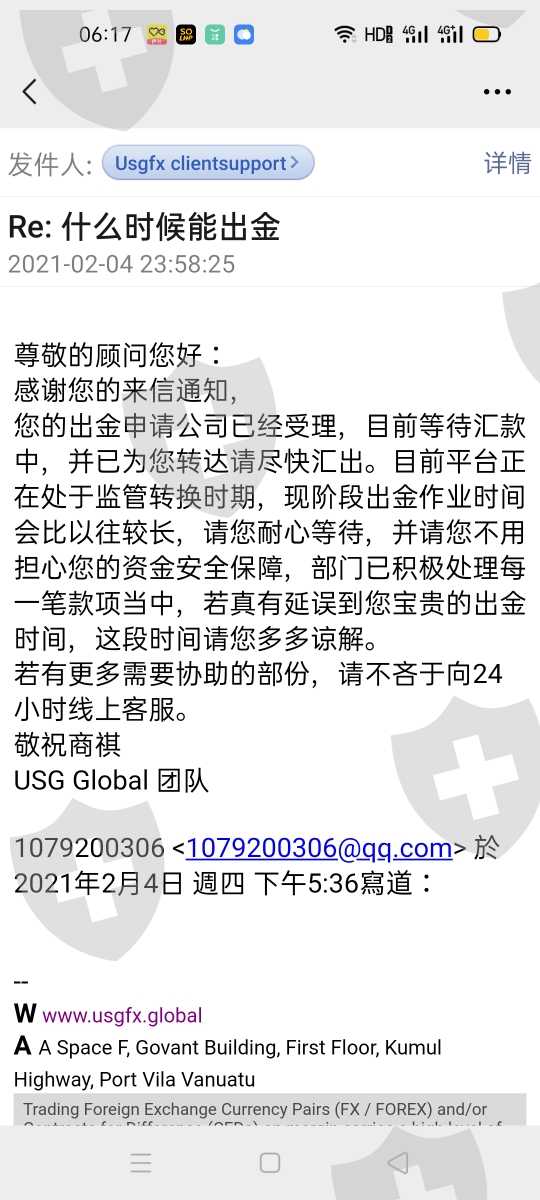 去年9月22日4100多美金在usgfx出金到现在都没有到账
